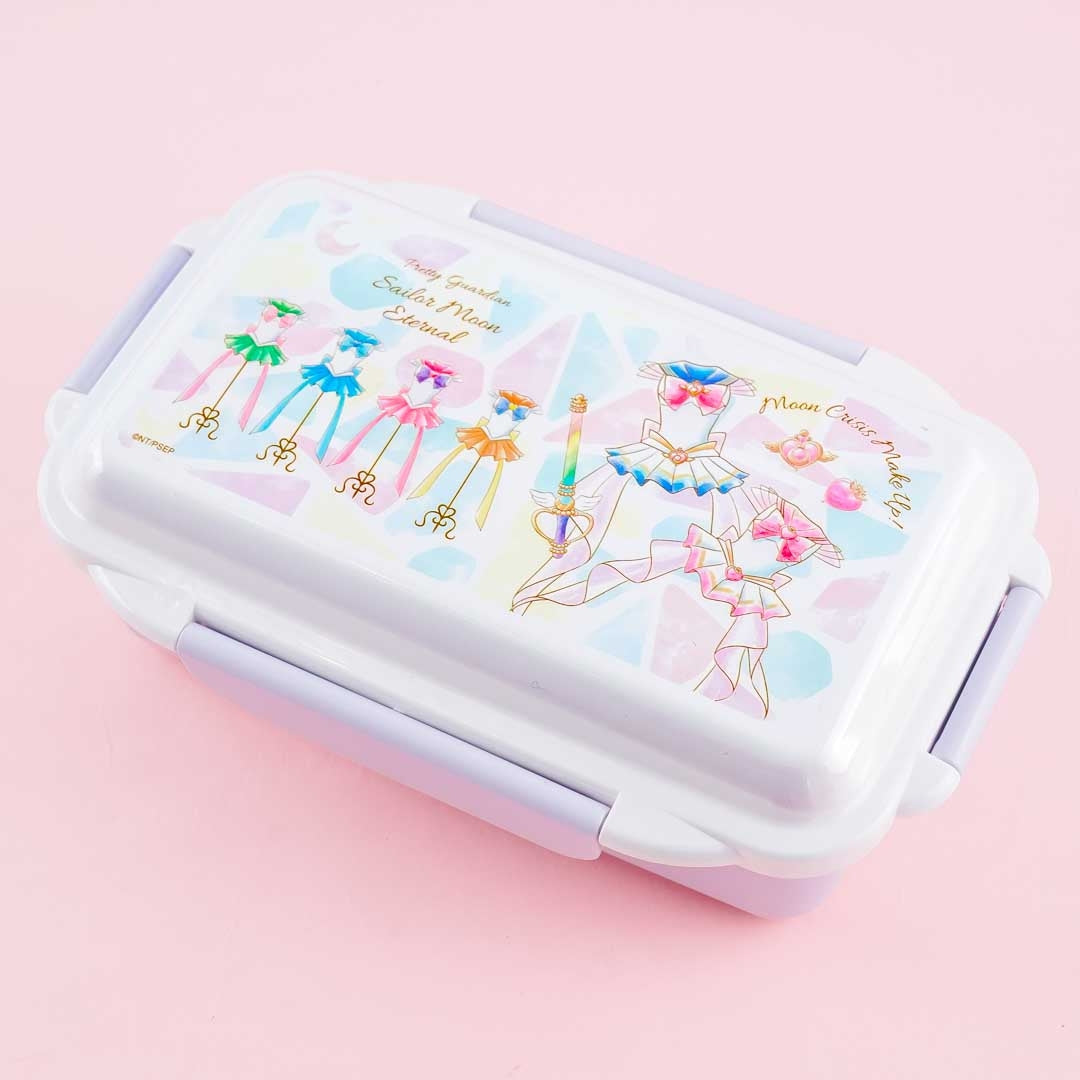 A cute rectangle lunch box with illustrations of the Senshi costumes of Super Sailor Moon, Super Sailor Chibi Moon, and the main 4 Sailor Guardians