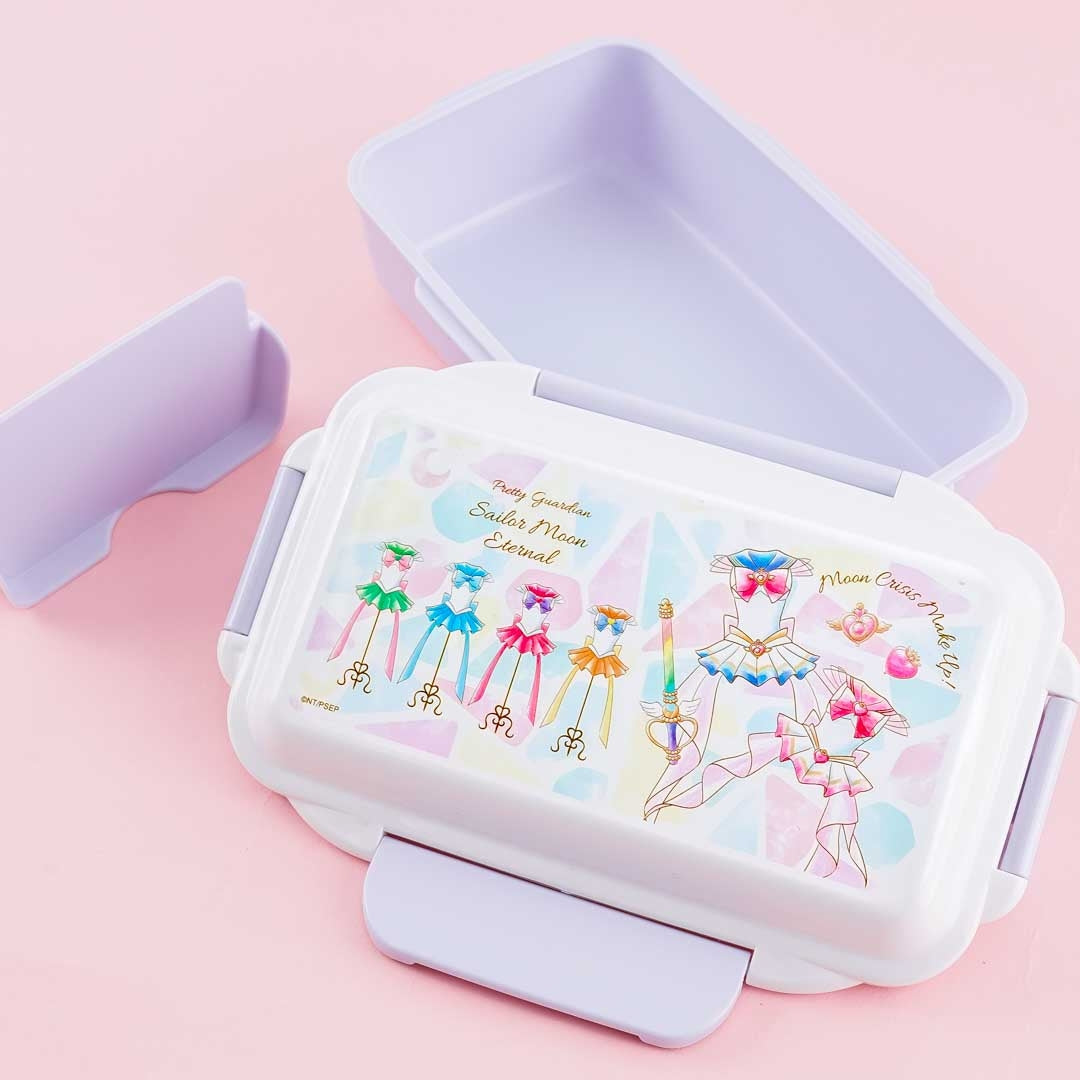 Have a blast making kyarabens inside this rectangular lunch box! Its lid has quadruple side locks and features the different costumes of the four main Sailor Senshis, as well as the guardian outfits of Super Sailor Moon and Super Sailor Chibi Moon! This super cute bento has a removable partition and is made of durable material, and is both safe for microwave and dishwasher use, sans lid.