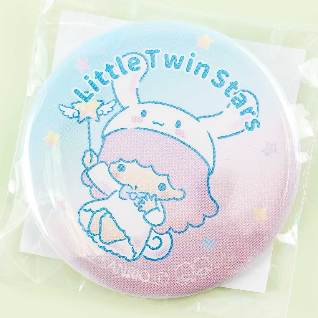 A super cute badge featuring Lala of the Little Twin Stars wearing a Cinnamoroll hat