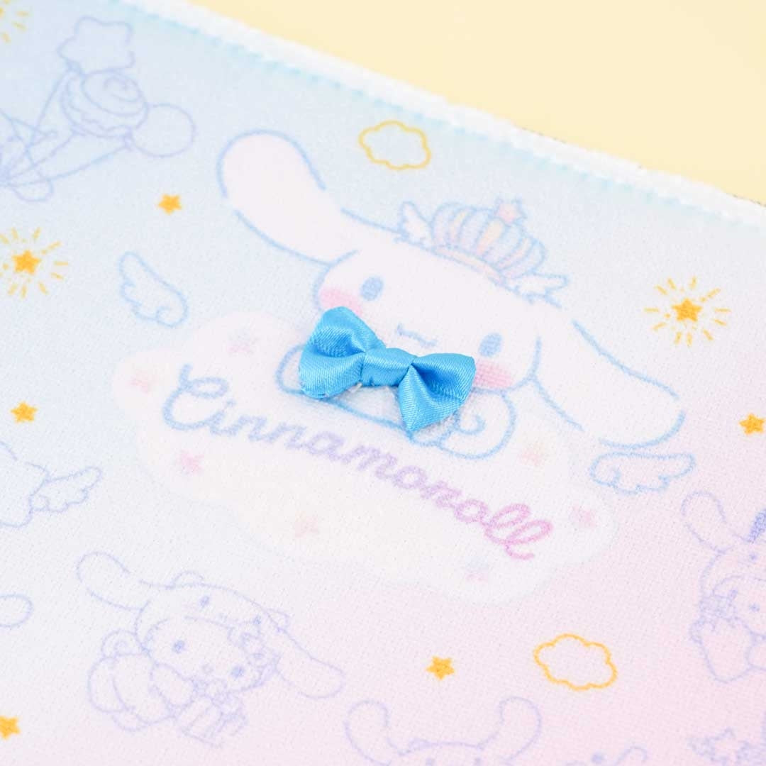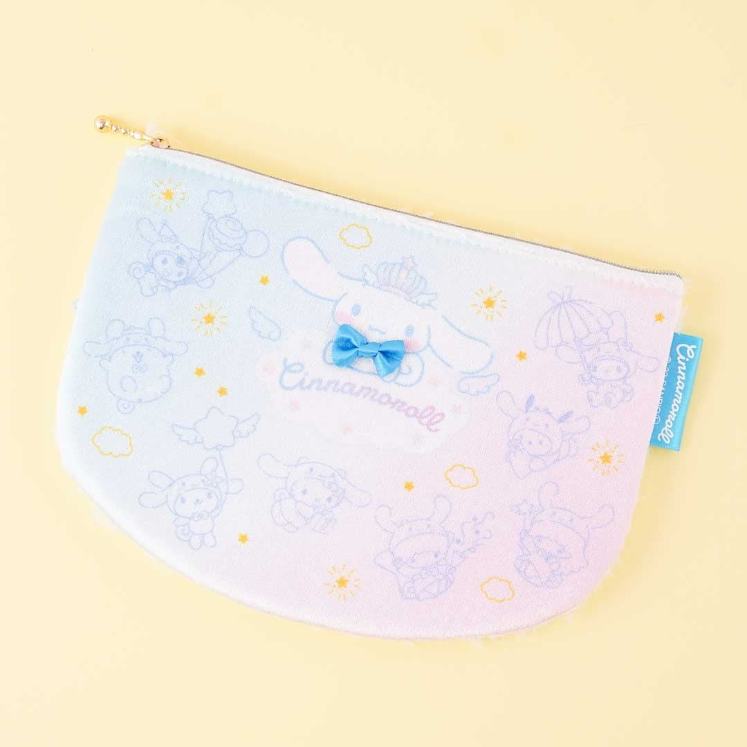 • A kawaii zippered pouch decorated with illustrations of Cinnamoroll and friends wearing costumes playing among the clouds