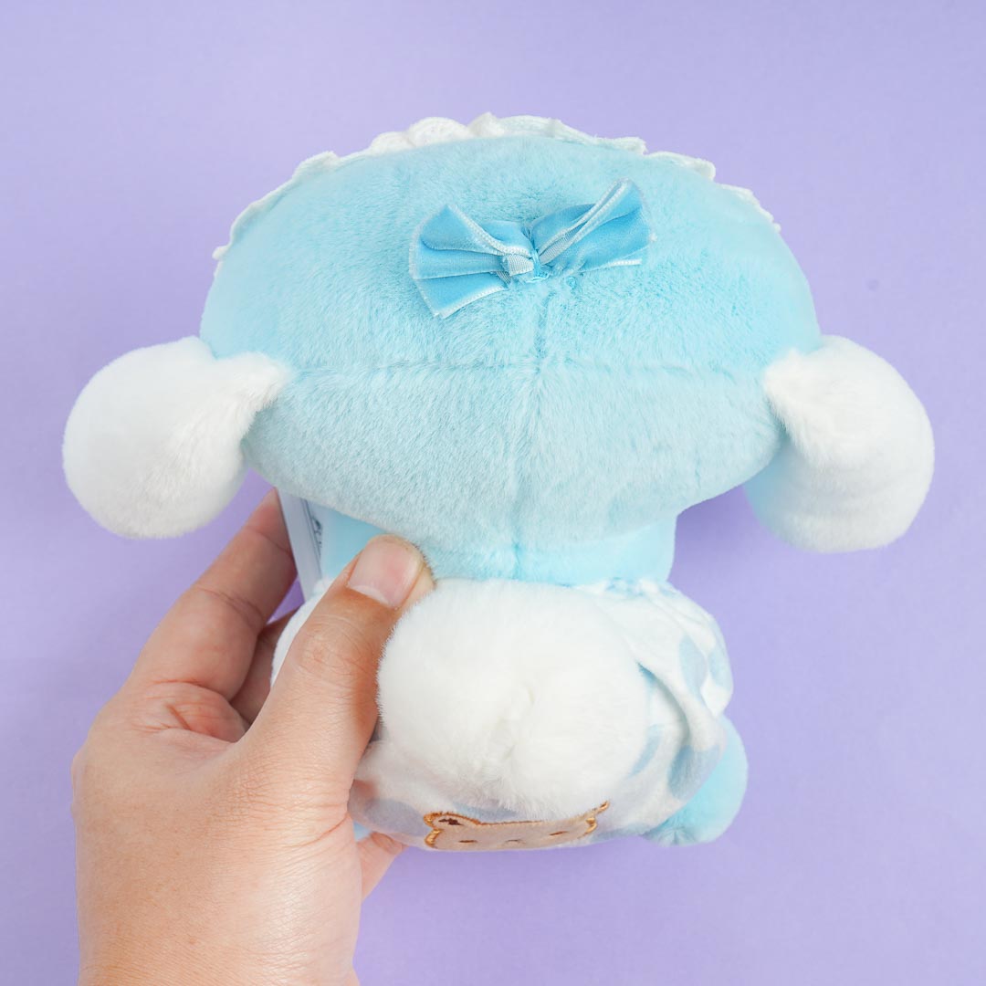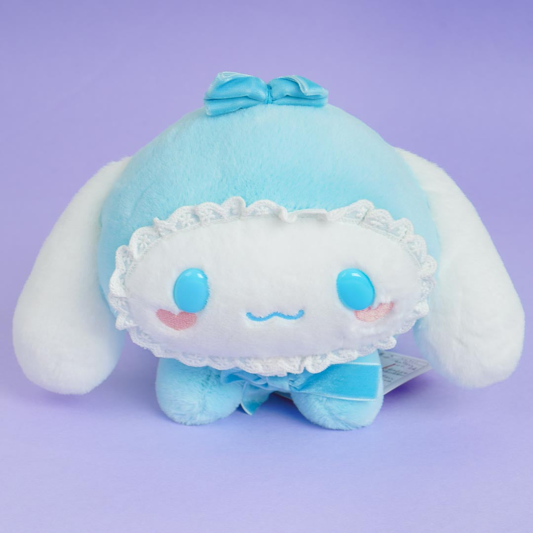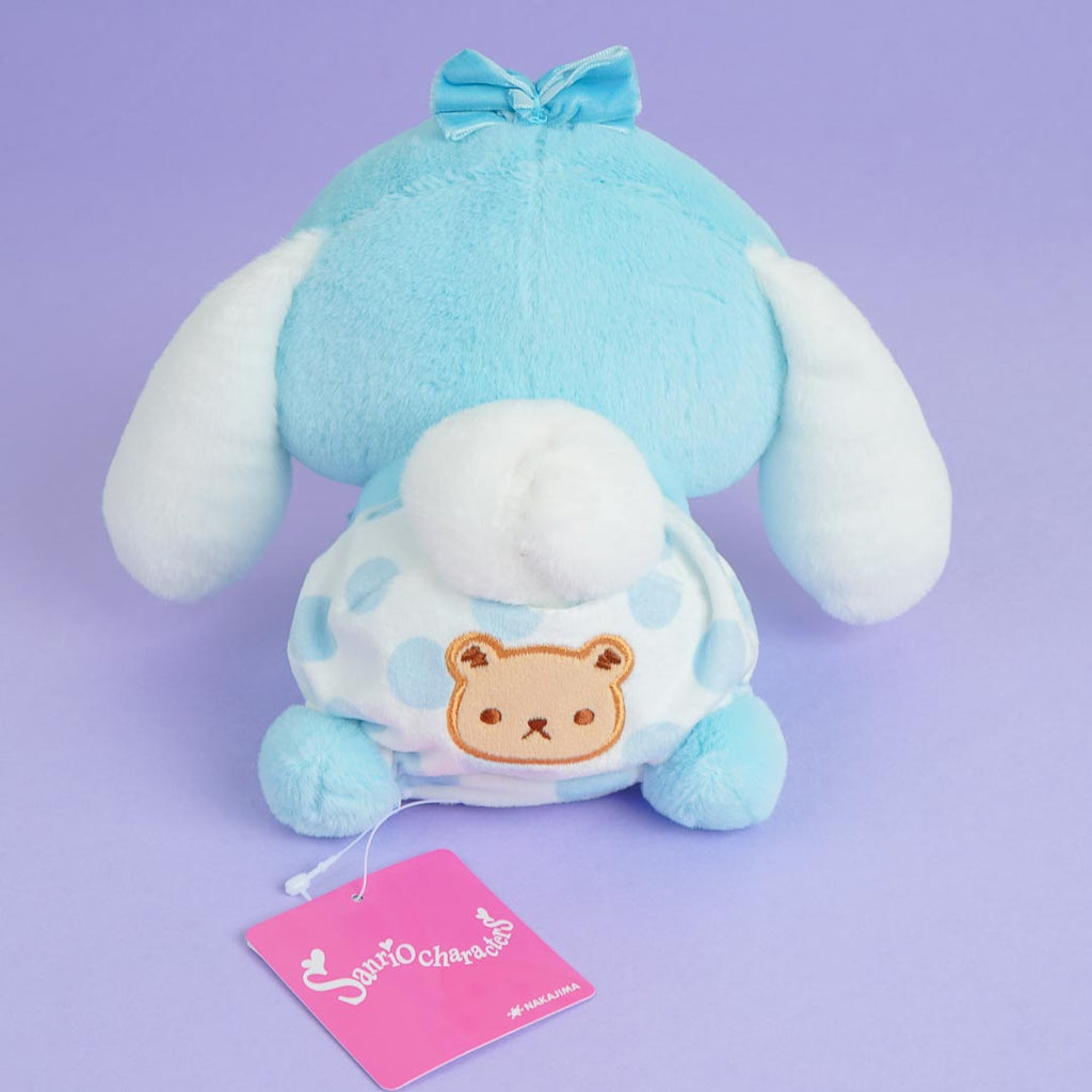 Have fun playing with this super kawaii Cinnamoroll plushie! It's a medium-sized stuffed toy that looks like a baby with a cute diaper and lace hoodie.