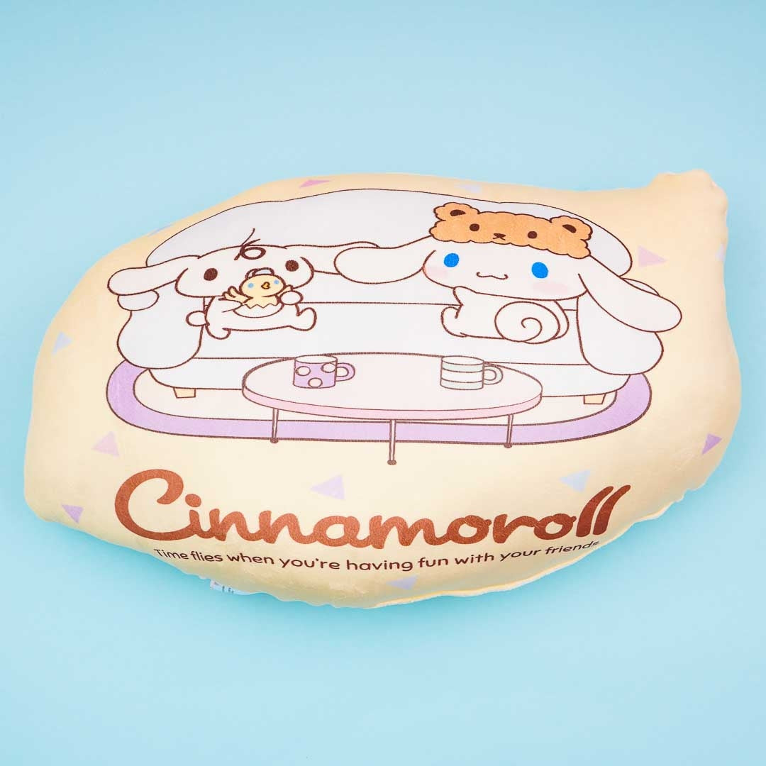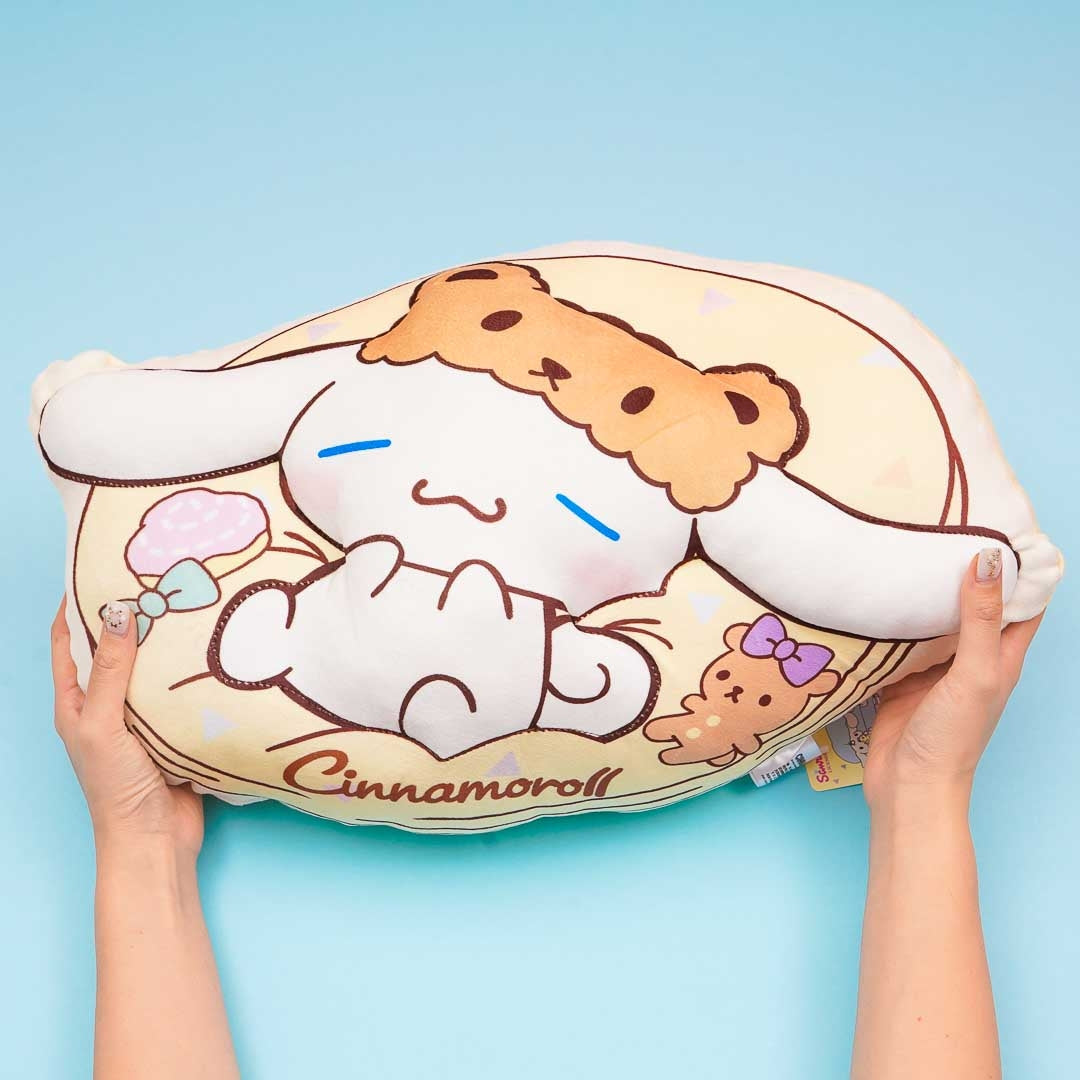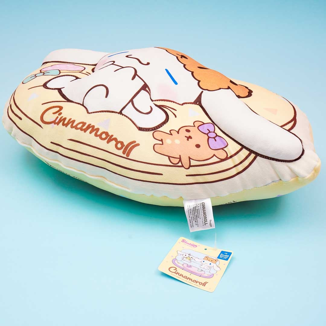 A kawaii cushion with an embossed print of a smiling Cinnamoroll getting ready to sleep