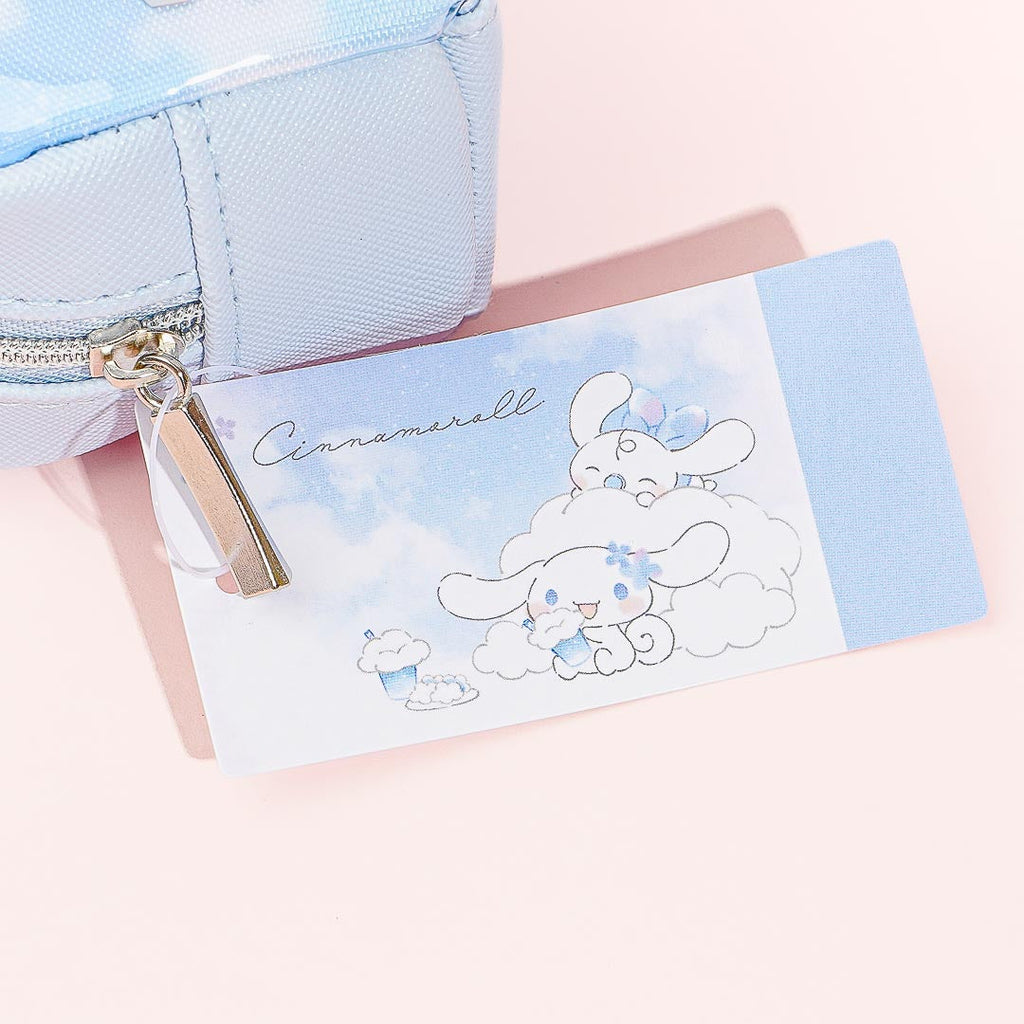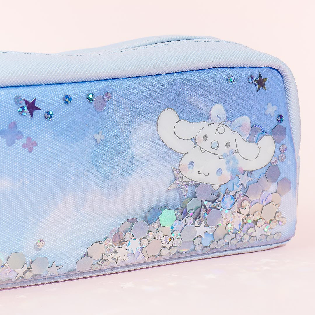 This kawaii zippered pencil case features a print of Cinnamoroll and his buddy Milk flying among the clouds. It has a cute transparent layer filled with glitter flakes! Use it to store your pencils, pens, and other writing instruments.