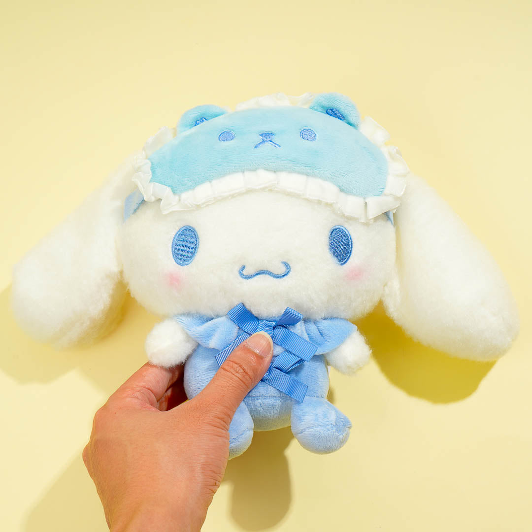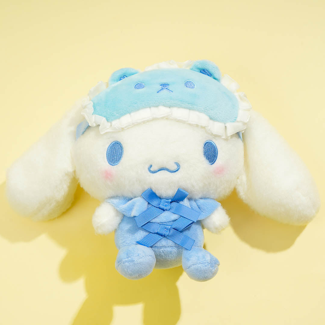 This kawaii Cinnamoroll plushie is dressed in cute pajamas with a matching bear eye mask. Place this small-sized cutie on your bed for a kawaii room decor! It comes from the Sanrio "Good Friend Pajamas" series.