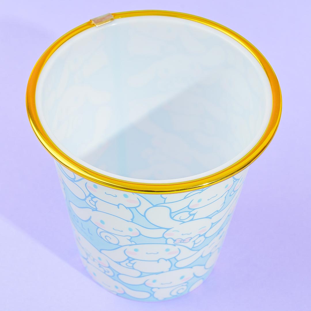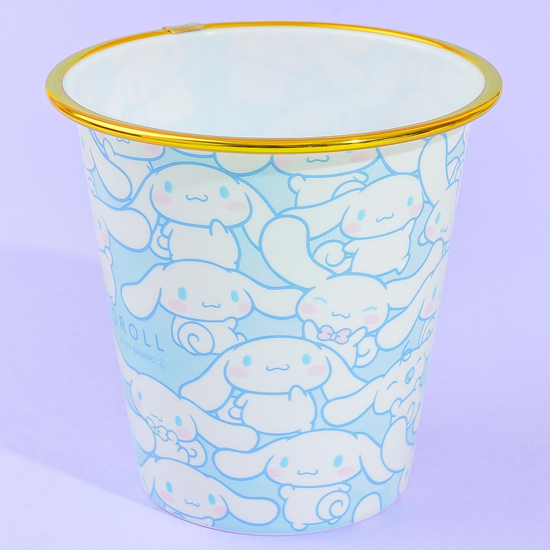 Throw your paper trash in this kawaii-looking trash can! It features cute prints of Cinnamoroll gathered together. This also has a gold rim and comes in a mini size so you can place it on your desk.