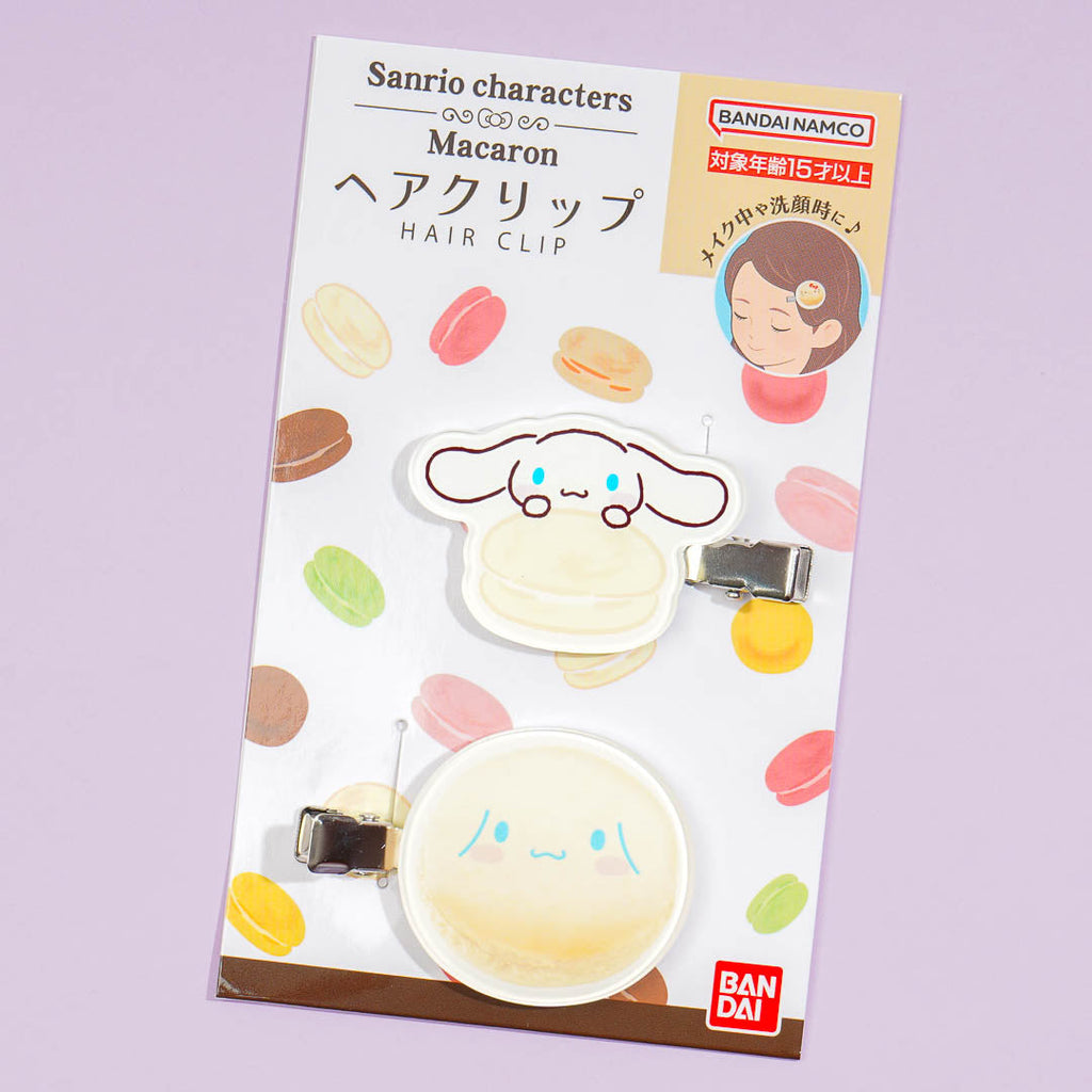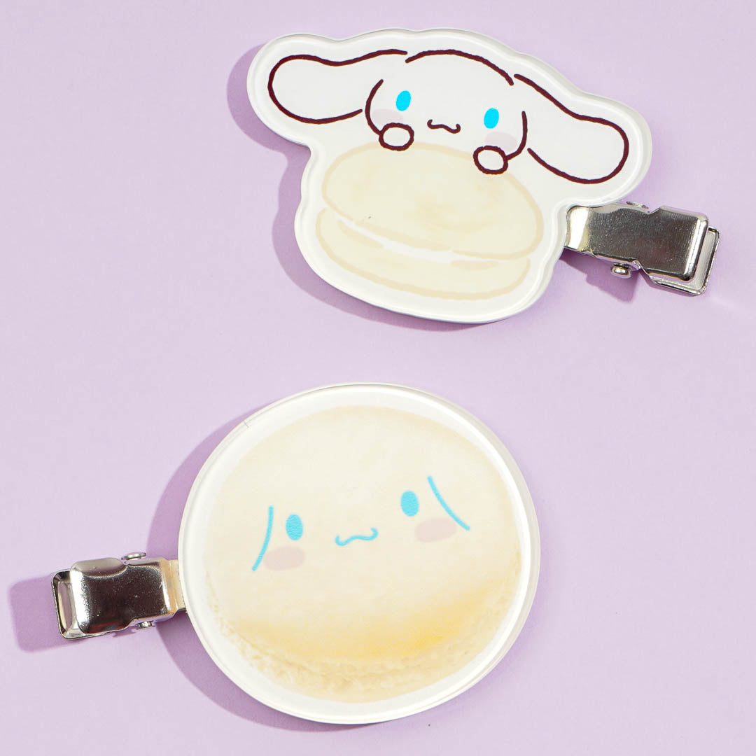 Complete your kawaii look for the day with this super cute set of hair clips. One of the clips features Cinnamoroll transformed into a macaron! The other is illustrated with Cinnamoroll playing with one.
