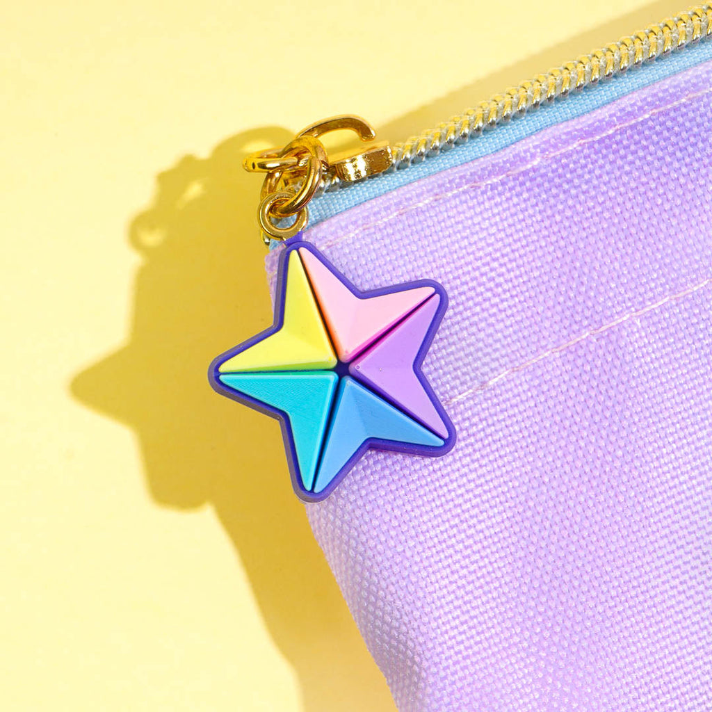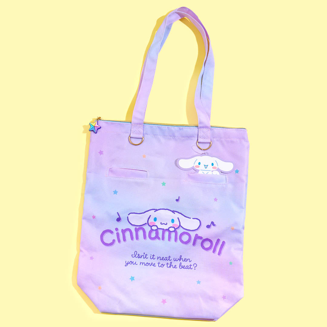 This kawaii tote bag is perfect for bringing your travel essentials! It features a cute musical galaxy design with a gradient color, musical notes, colorful stars, and Cinnamoroll. This bag also has two small outer pockets and an inner pocket for organizing your trinkets! Plus, it comes with a star-shaped zipper and a Cinnamoroll charm.