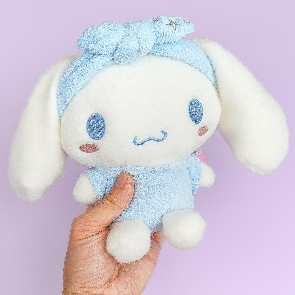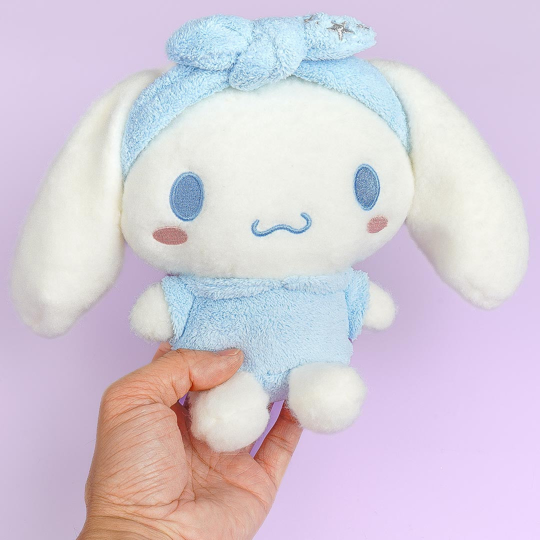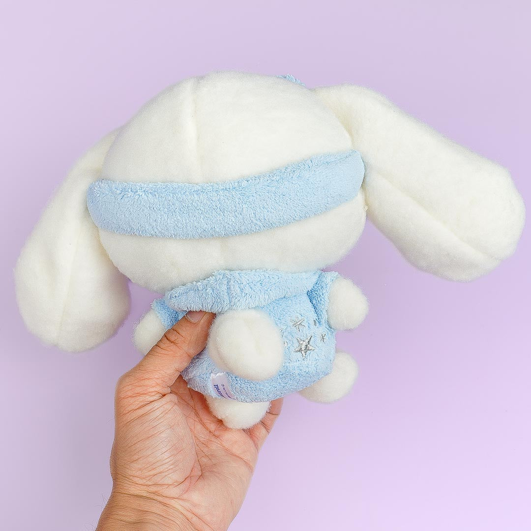 Have a comforting sleep with this cute medium-sized Cinnamoroll plushie by your side! It's wearing a fluffy pajama with a matching knotted headband for a more kawaii look.