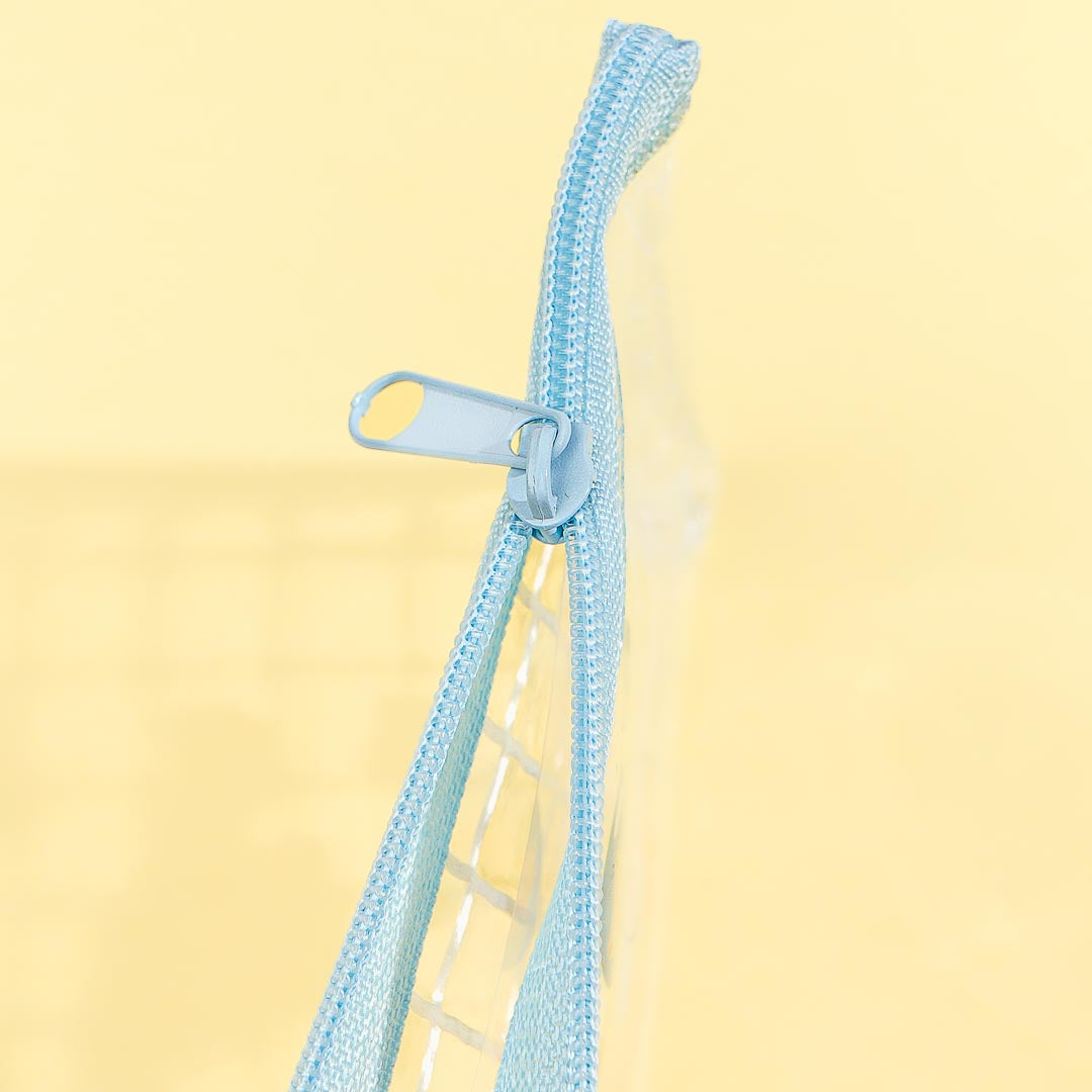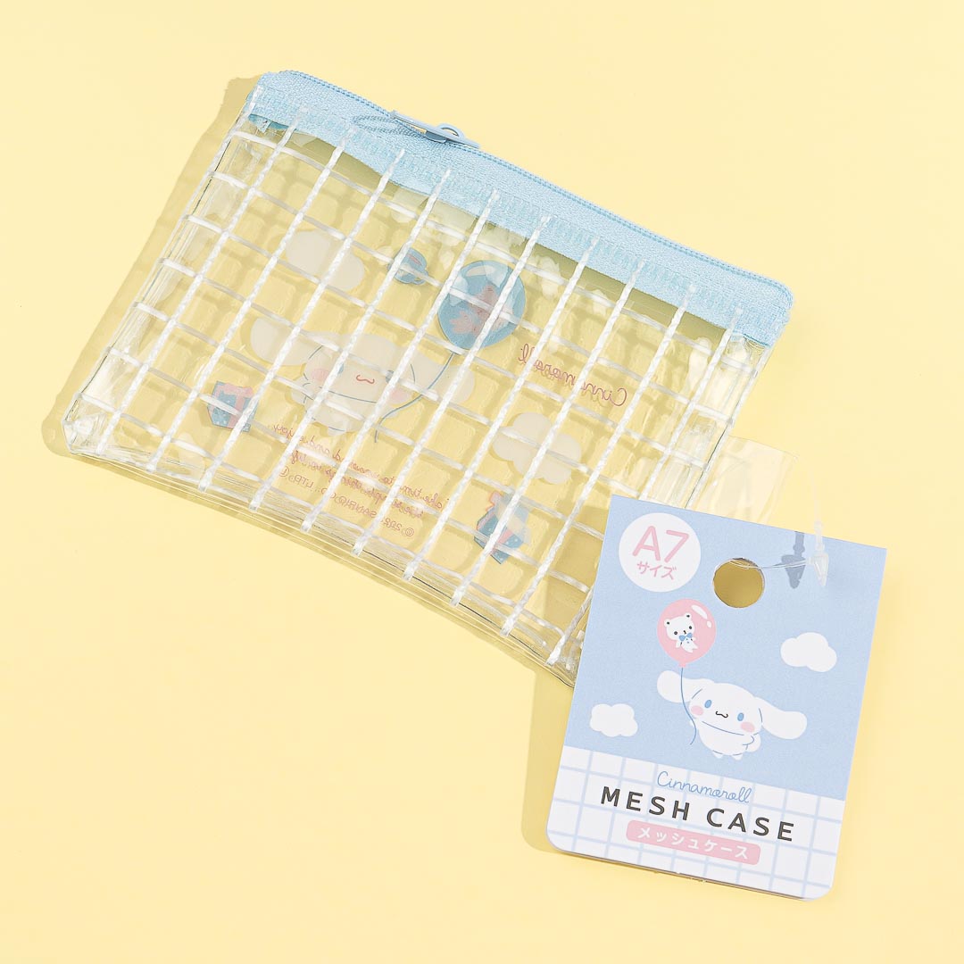 Store your lipstick, blush-on, and other small makeup items in this cute mini flat pouch.  It's decorated with illustrations of Cinnamoroll floating in the sky! This clear A7-sized pouch has a zipper closure to help keep all your things inside.