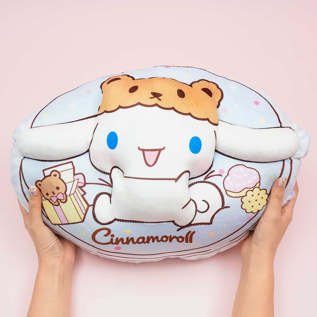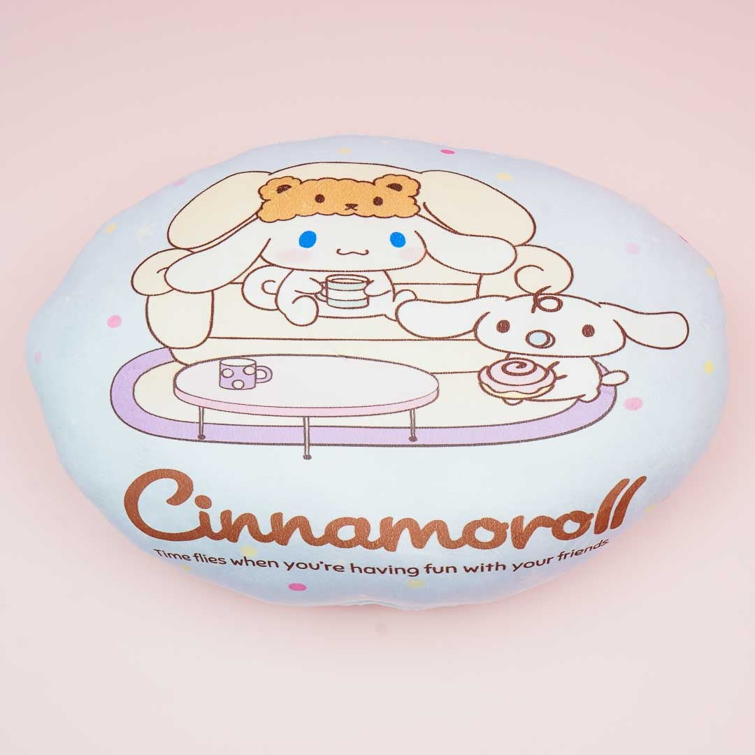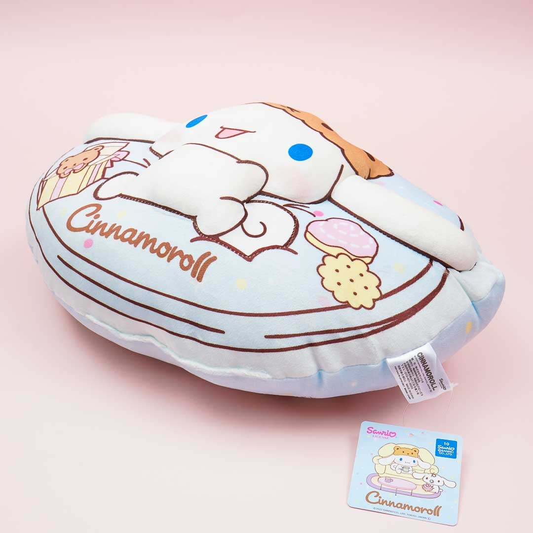 A super cute cushion with an embossed print of Cinnamoroll having a pajama party