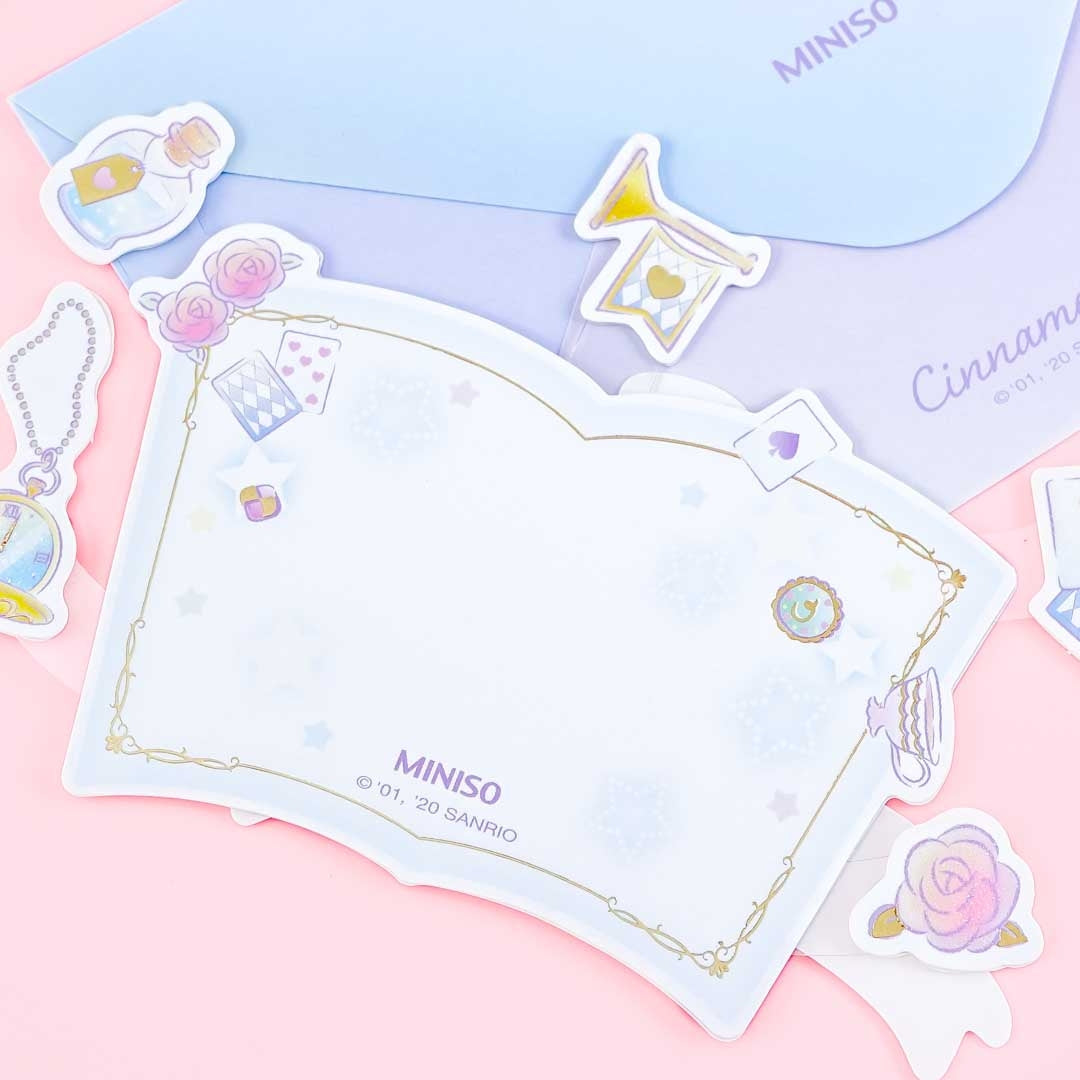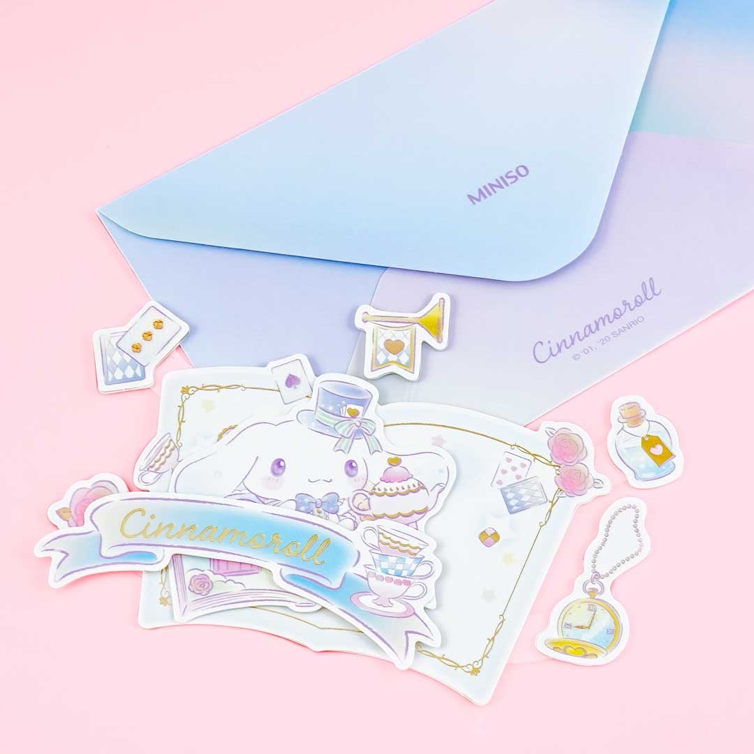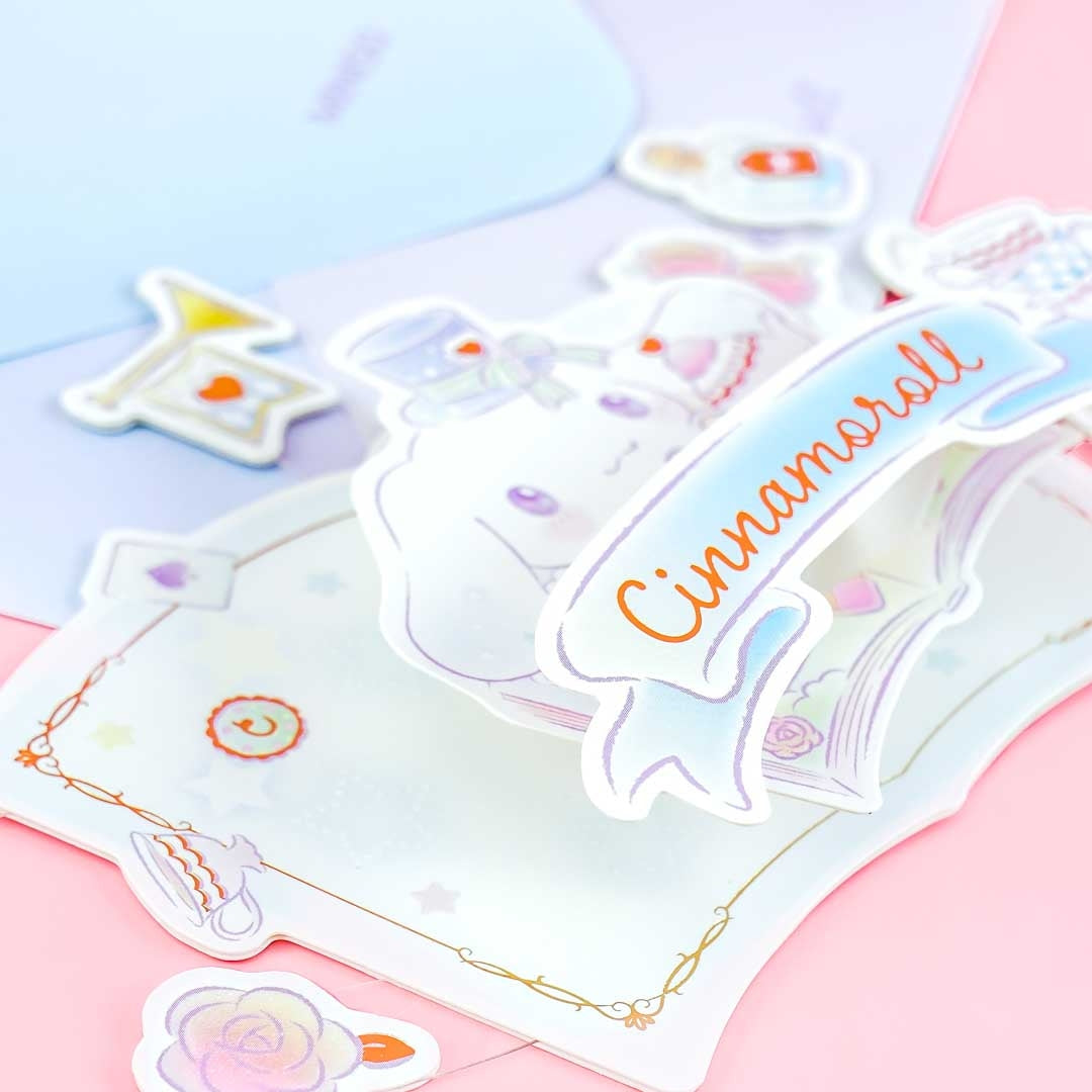 This super kawaiii pop-up greeting card is illustrated with Cinnamoroll having a fantasy tea party! It features lovely golden details. Write warm messages on the card, place it inside its envelope, and send it to your special someone!