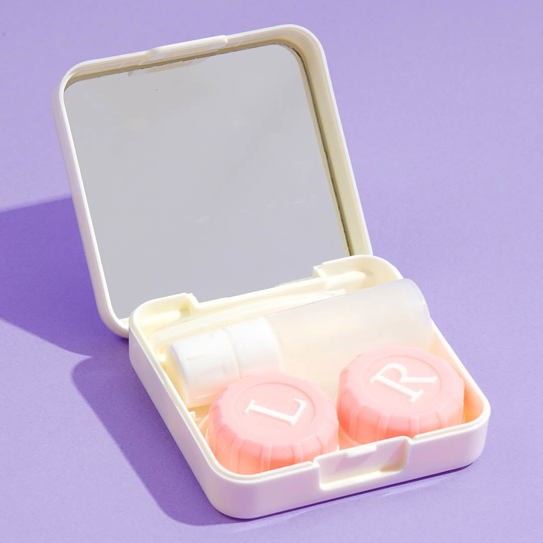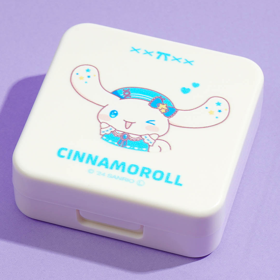 Keep your contact lenses clean and safe with this lens case set featuring Cinnamoroll dressed as a Lolita doll! It includes a compact mirror, a lens solution bottle, and a dual contact lens case with caps labeled "L" and "R" for easy use. The slim case fits perfectly in your bag so it's travel friendly!