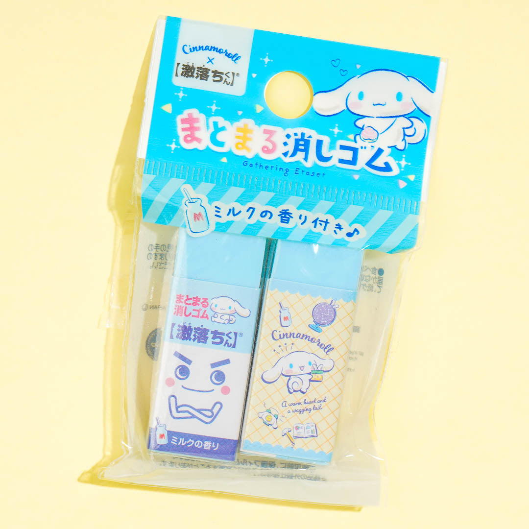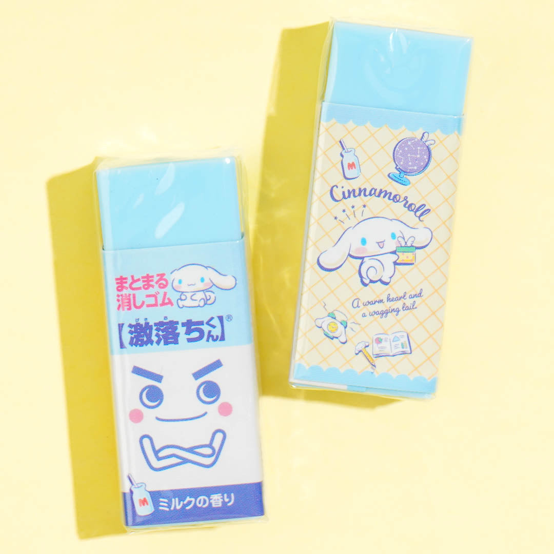 Erase your writing mistakes using this super cute set of rubber erasers! The covers are decorated with prints of Cinnamoroll and Gekiochi-kun, the famous cleaning sponge from Japan. Each eraser features a sweet milk scent!