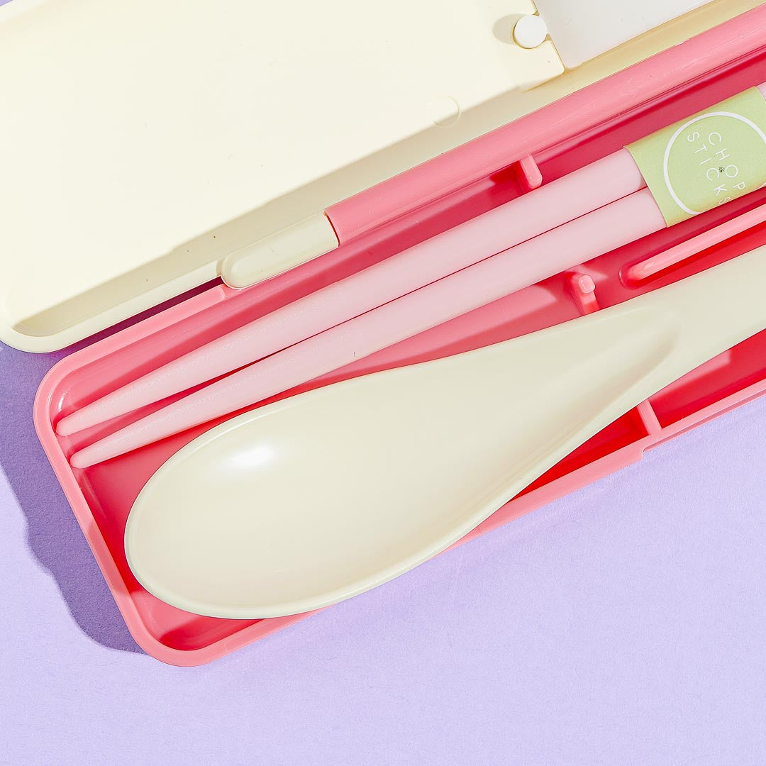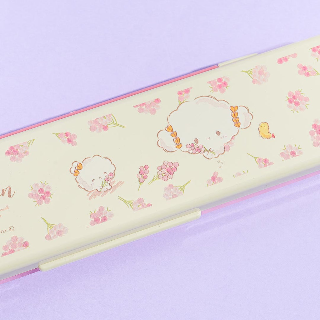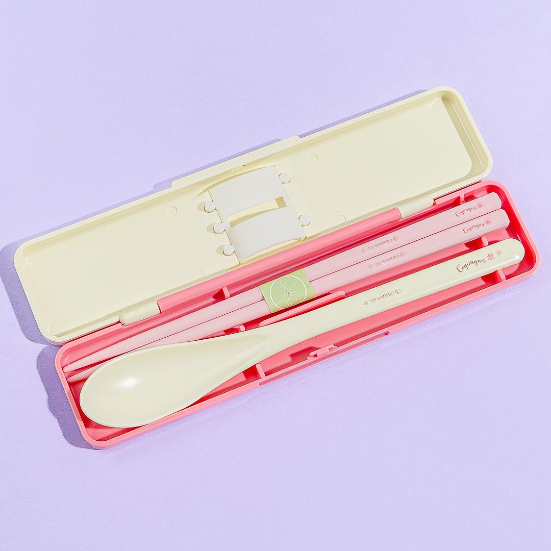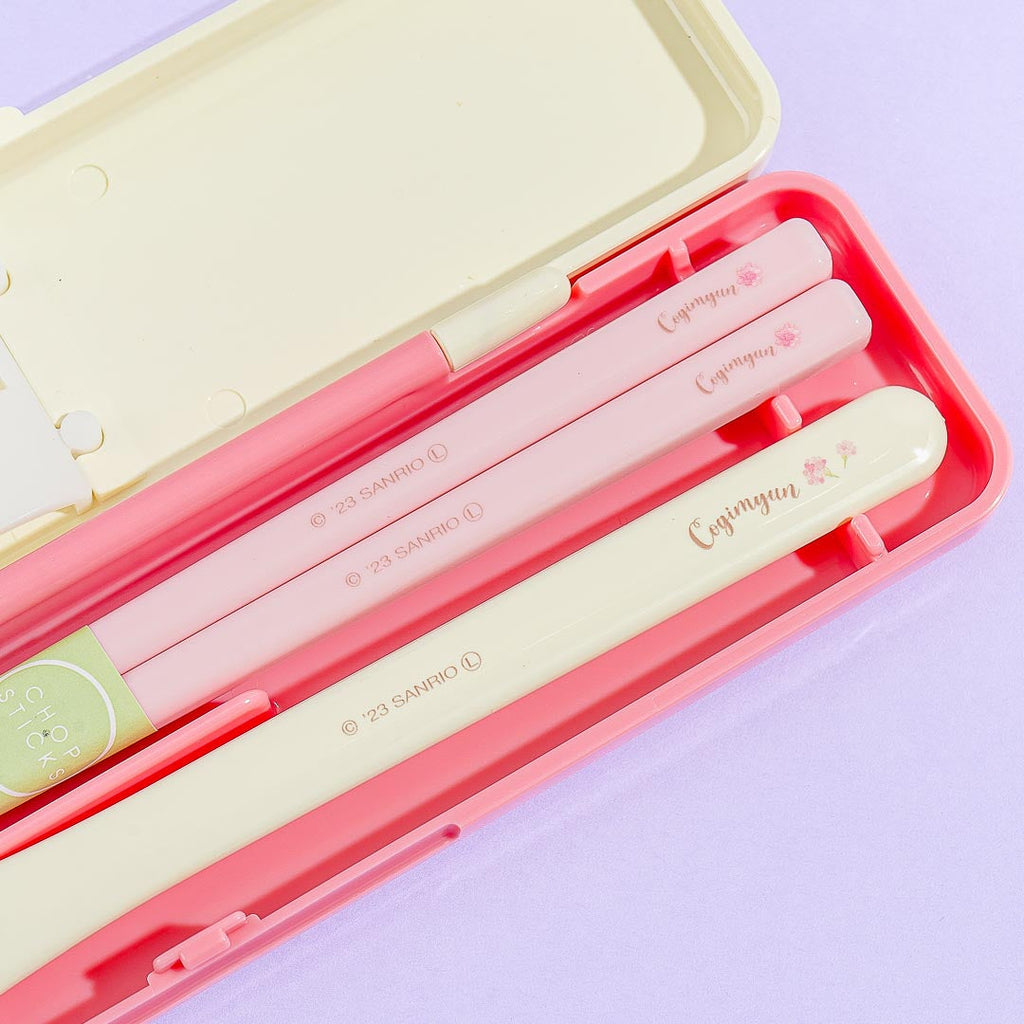 Add this kawaii utensil set to your lunch box! It features prints of Cogimyun and lots of pretty flowers. This set includes a pair of acrylic chopsticks with non-slip tips, a narrow spoon, and a carrying case. The case lid has a silicone cushion inside to prevent clicking noises!