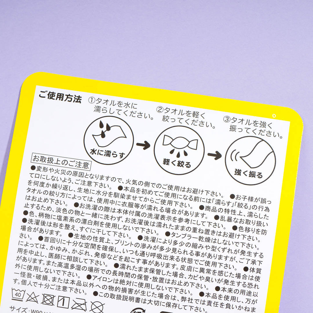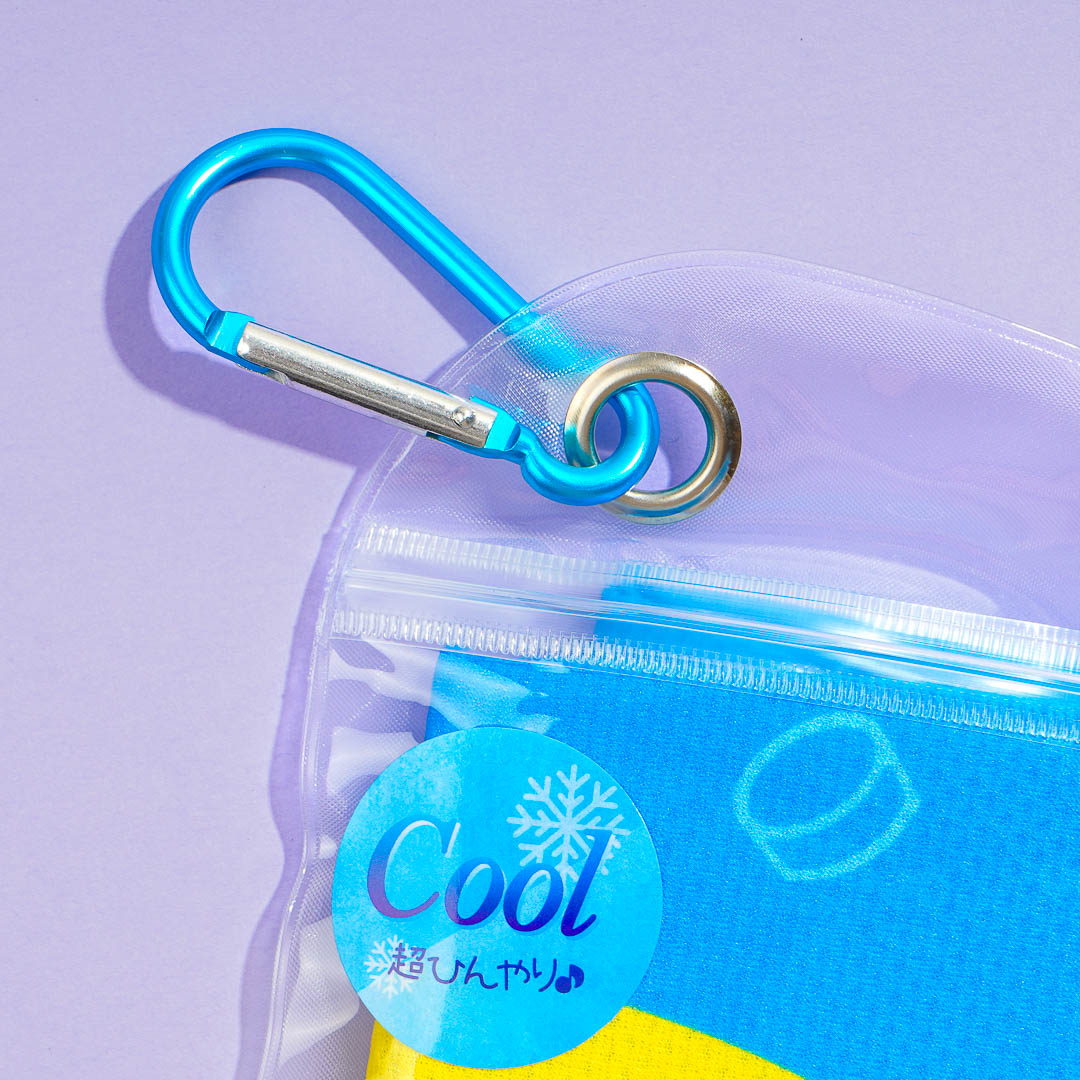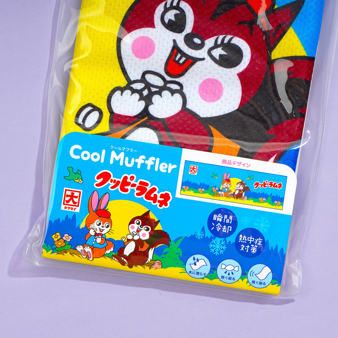 Keep cool while traveling around with this heat-stroke-preventing muffler scarf illustrated with cuties from Cuppy Ramune candy! All you have to do to use this scarf is to wet it with water, wring lightly, shake it strongly, and then wear it around your neck. The cool feeling lasts for a long while!