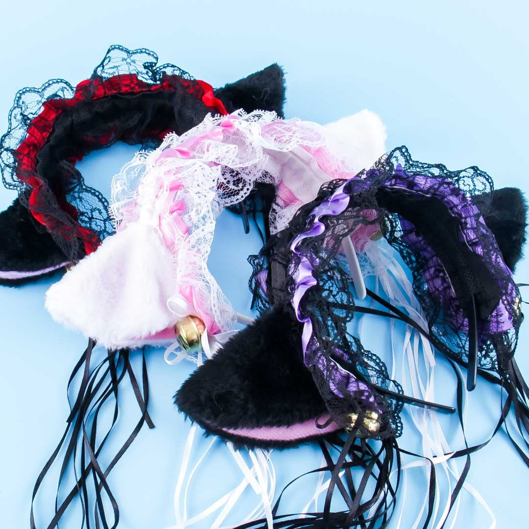Add this super cute headband to complete your Sweet Lolita outfit! This kawaii headband has a pair of furry cat ears, lace, ribbons, and bells.