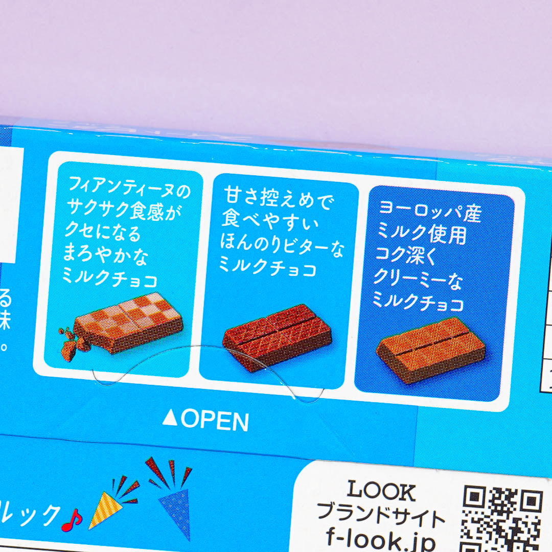 Enjoy this box of milk chocolates with your favorite hot beverage. It has three different types of milk chocolate for you to enjoy! There's crispy milk, sweet bitter milk, abd rich milk chocolate in the box.