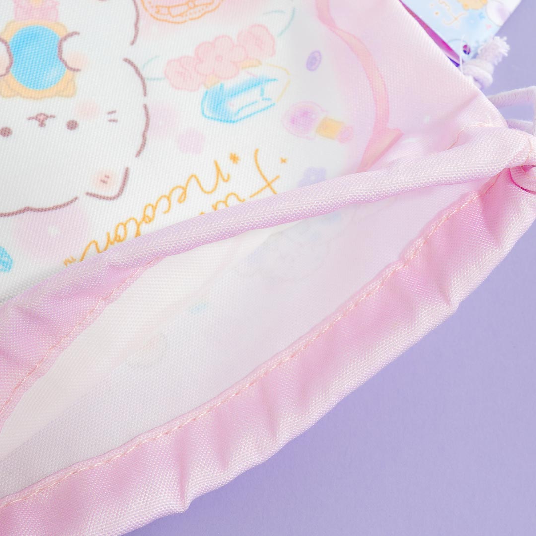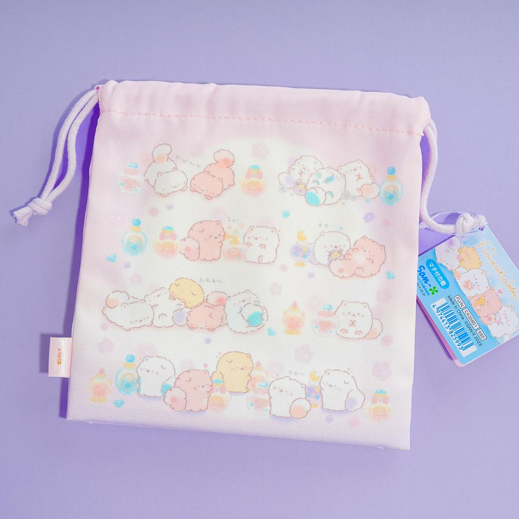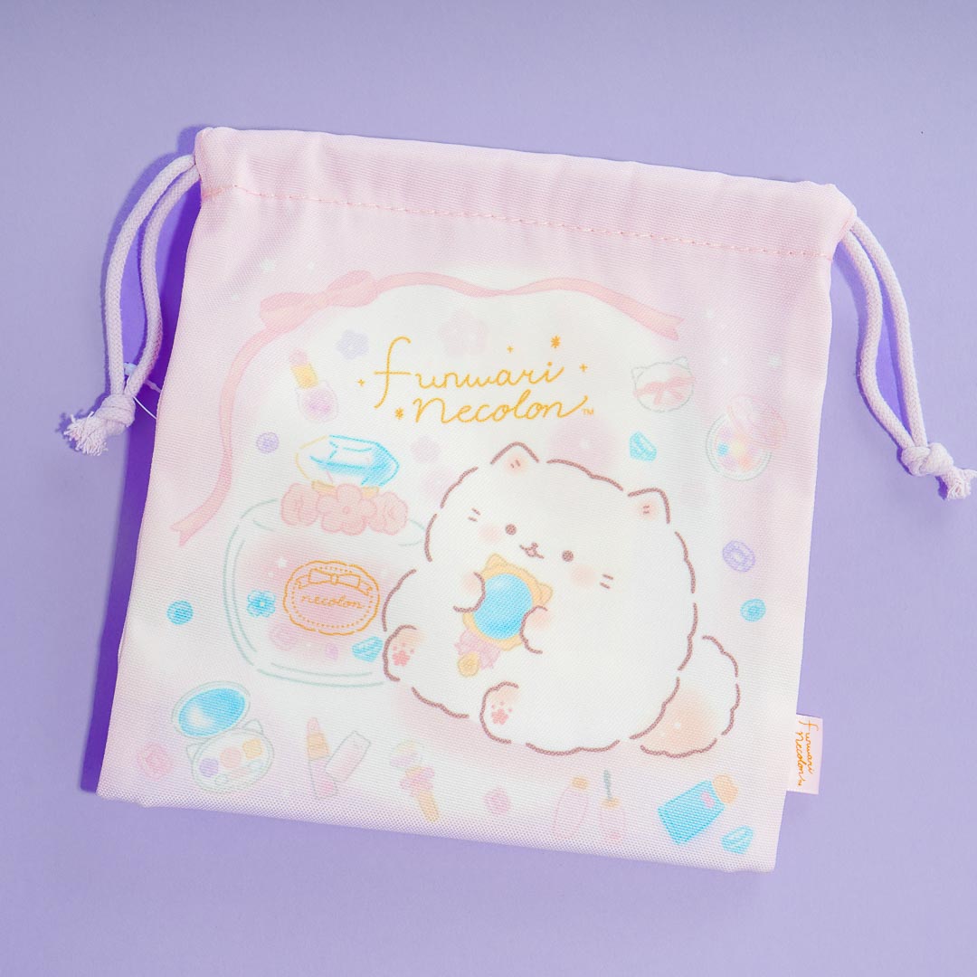 This cute drawstring pouch is illustrated with a print of Funwari Nekolon next to a bottle of perfume! Use it to store your charms, trinkets, and other knick-knacks. Pull the strings to close the pouch.