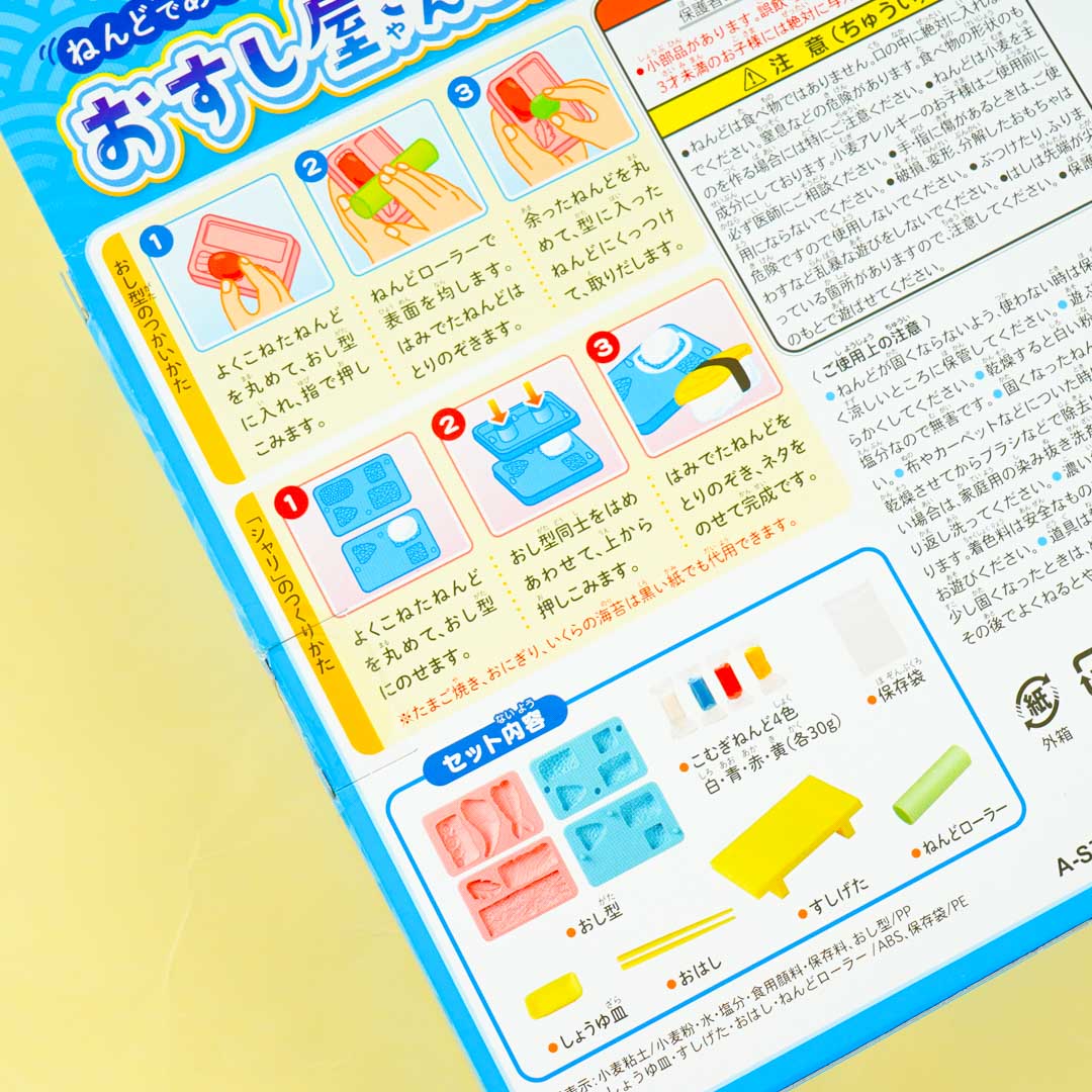 • Included: 4 x rice flour clay, 4 x sushi molds, 1 x sushi plate, 1 x soy sauce bowl, 1 x plastic rolling pin, 1 x mini plastic bag, and 1 x  pair of plastic chopsticks
