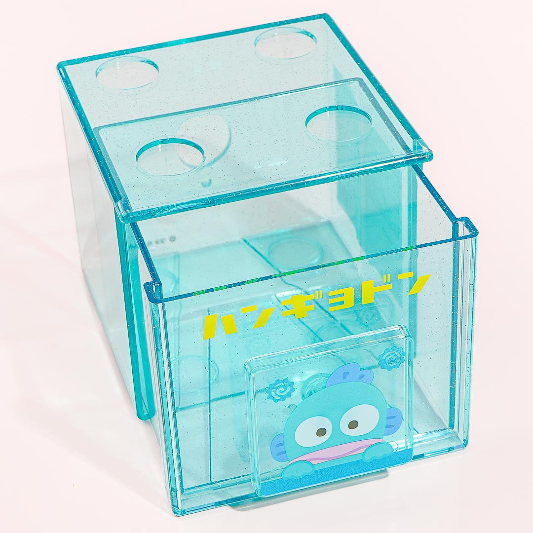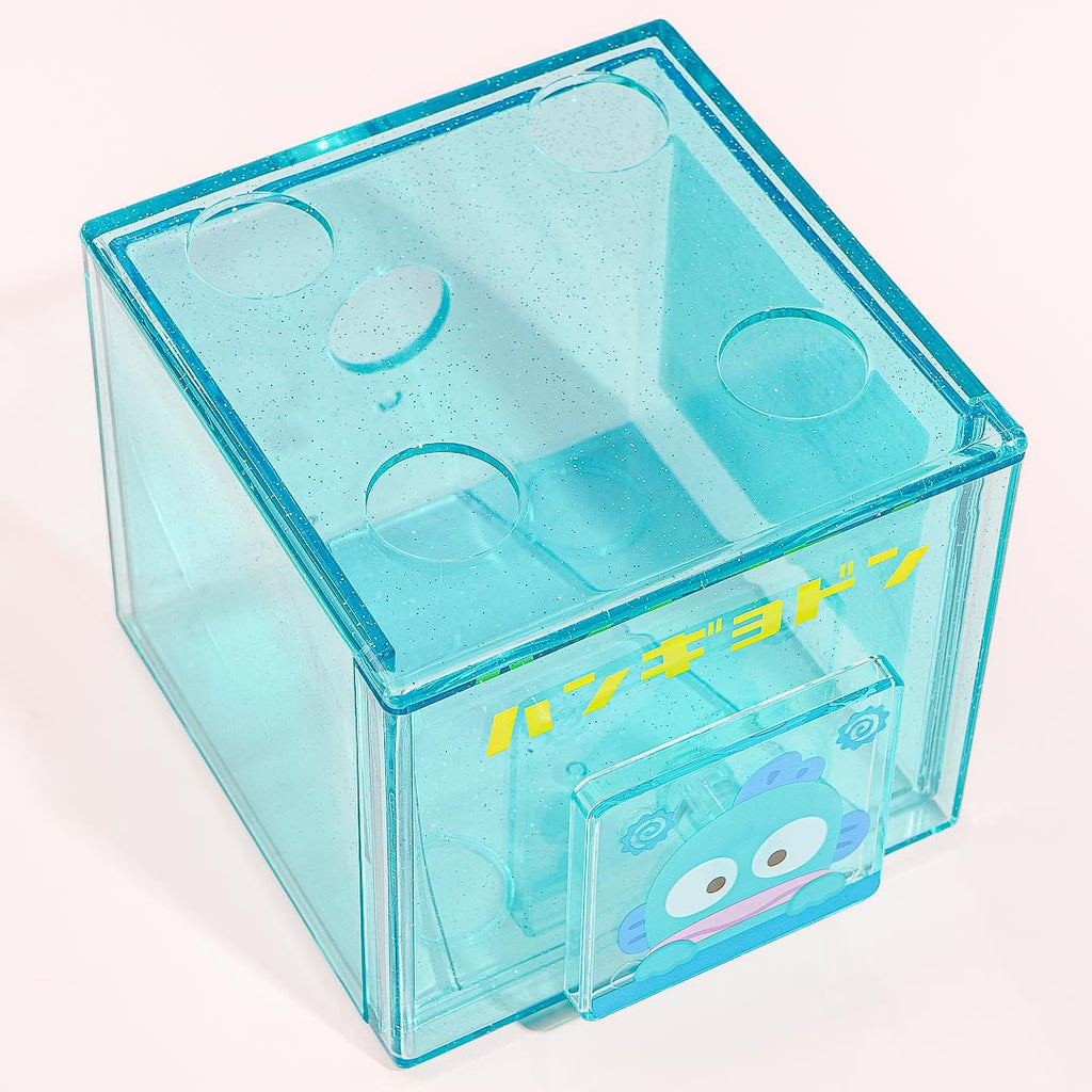 Keep your paper clips, pins, loose change, and other small random items inside this mini transparent chest with glitters! Its square-shaped handle has a super cute illustration of Hangyodon. The chest can also be stacked on top of cases from the same collection.