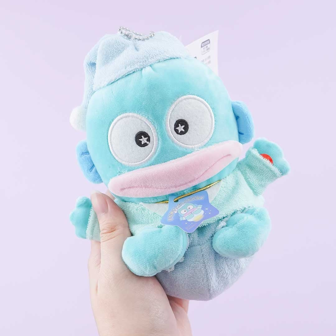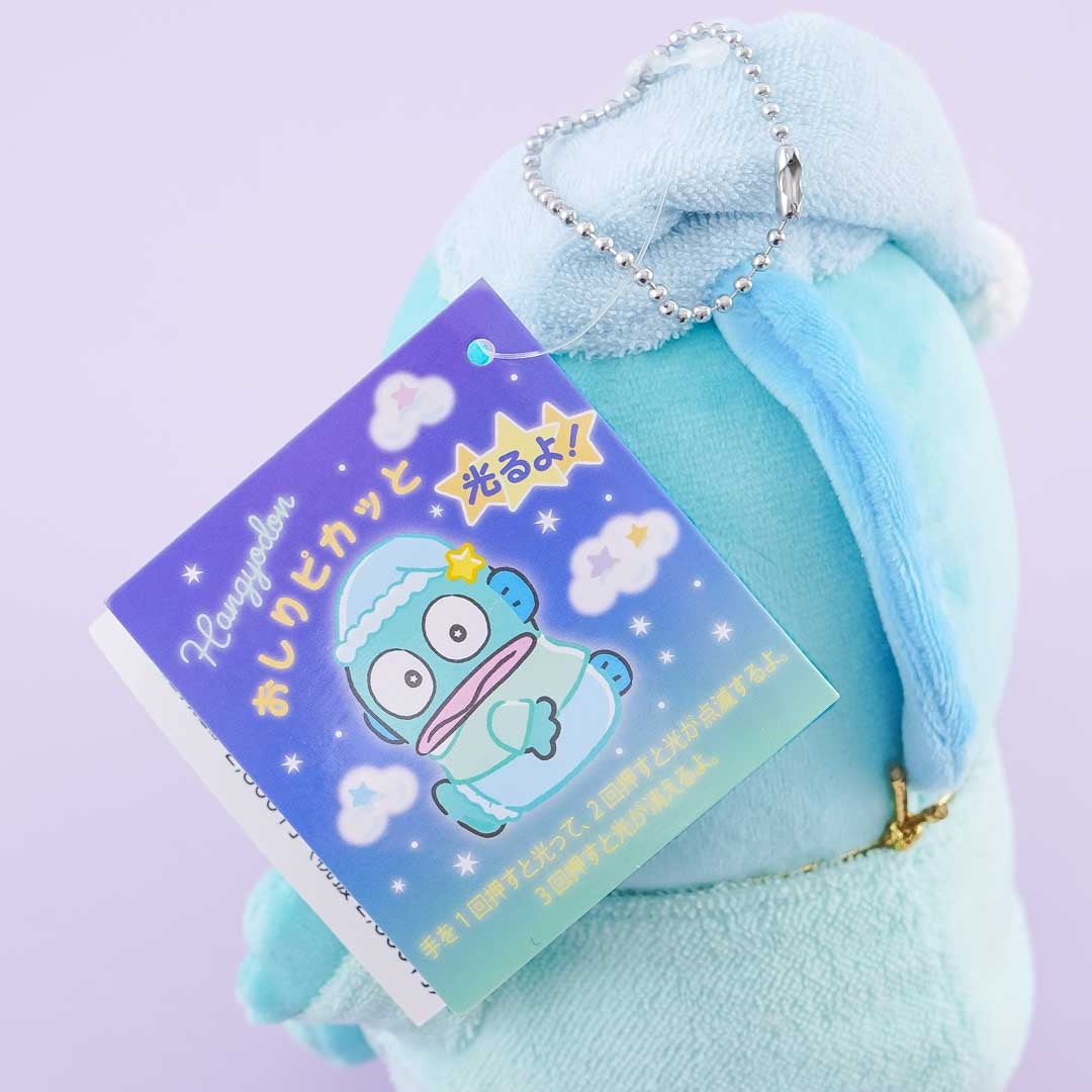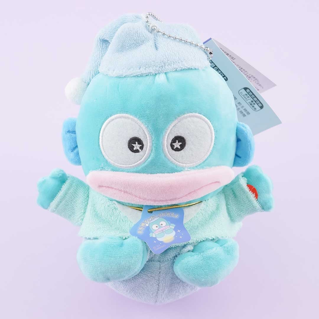 Have fun snuggling with this super cute Hangyodon plushie! This medium-sized cutie is wearing pajamas. Its butt shines when you press its hand. You can attach it to your favorite bag with its removable ball chain!