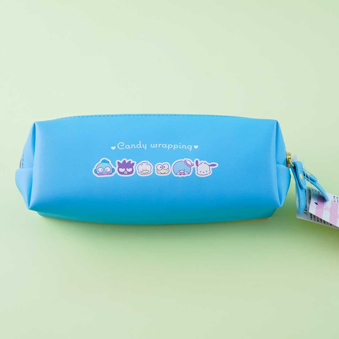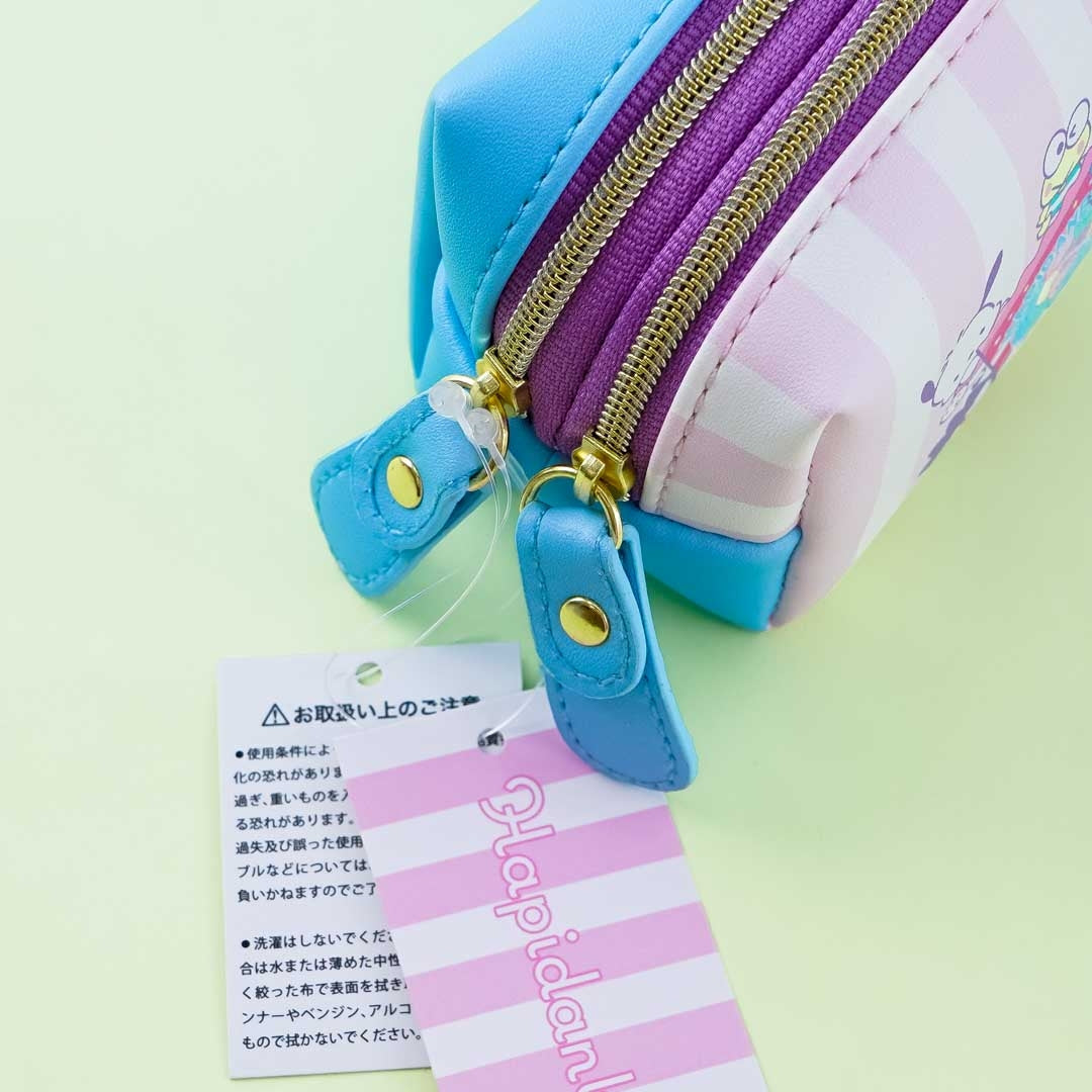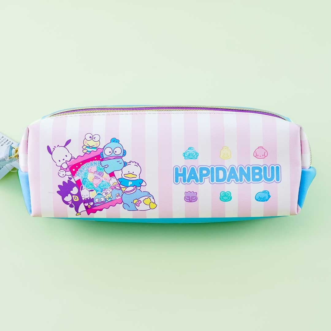 A kawaii pencil case featuring prints of Hapidanbui characters with a large pack of candy