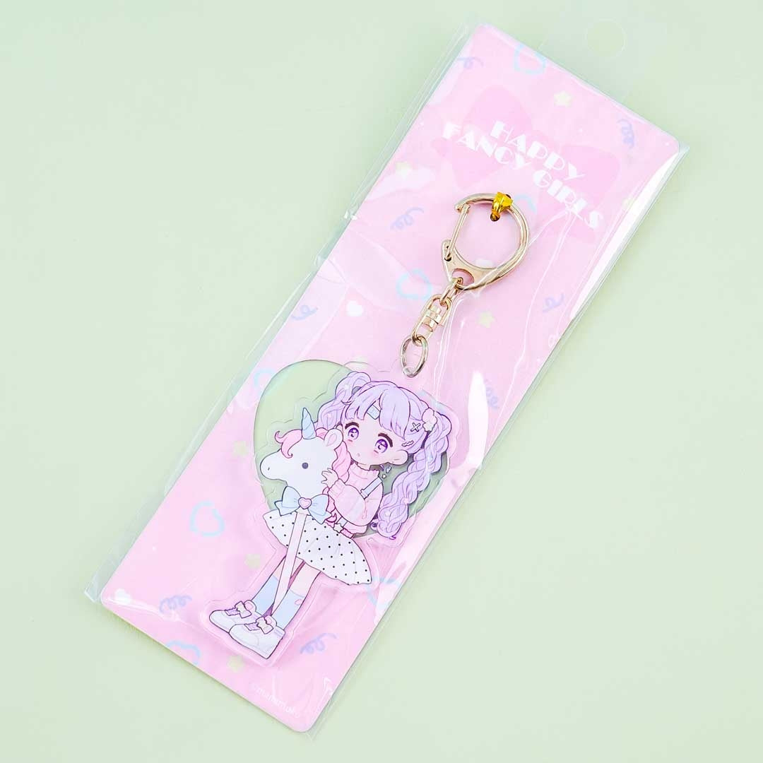 Decorate your bag by attaching this super kawaii acrylic charm featuring prints of a girl carrying a unicorn hobbyhorse! This charm has prints on both sides. It comes with a metal clip.
