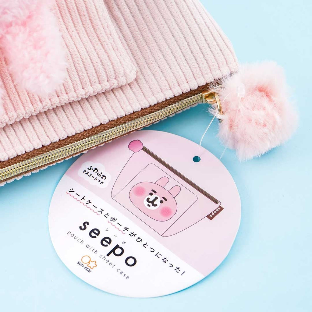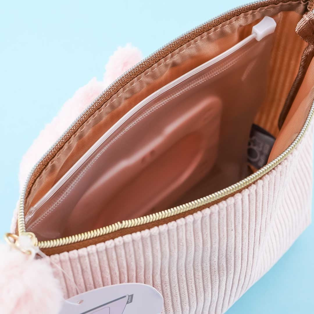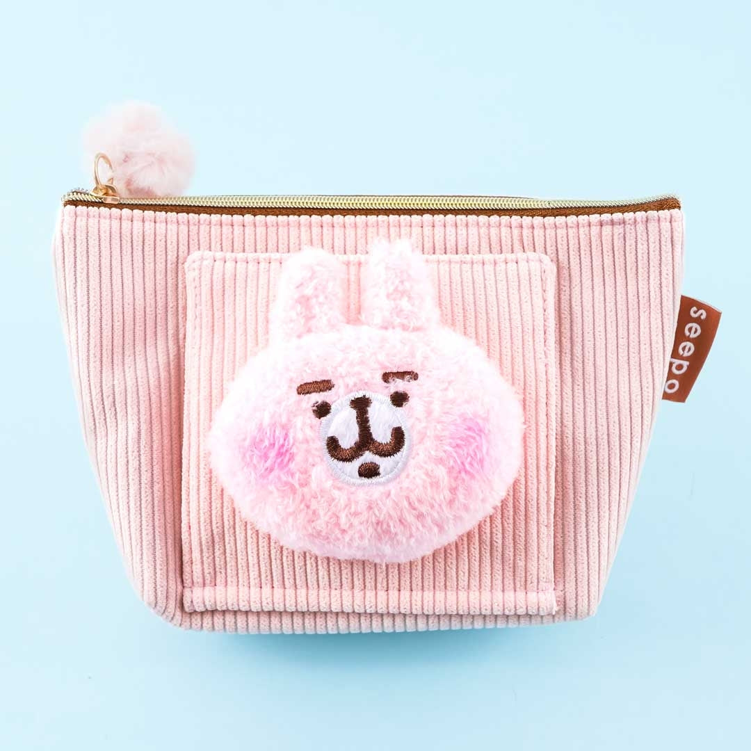 Keep your lipstick, blush, and other makeup products you use daily inside this super cute corduroy pouch with a fluffy Usagi head charm from Kanahei! It comes with dual magnetic snap locks and a zipper closure that has a fluff ball charm. This roomy beauty bag has a special plastic pouch area with a dispensing flap where you can specifically place your tissues or even makeup wipes.