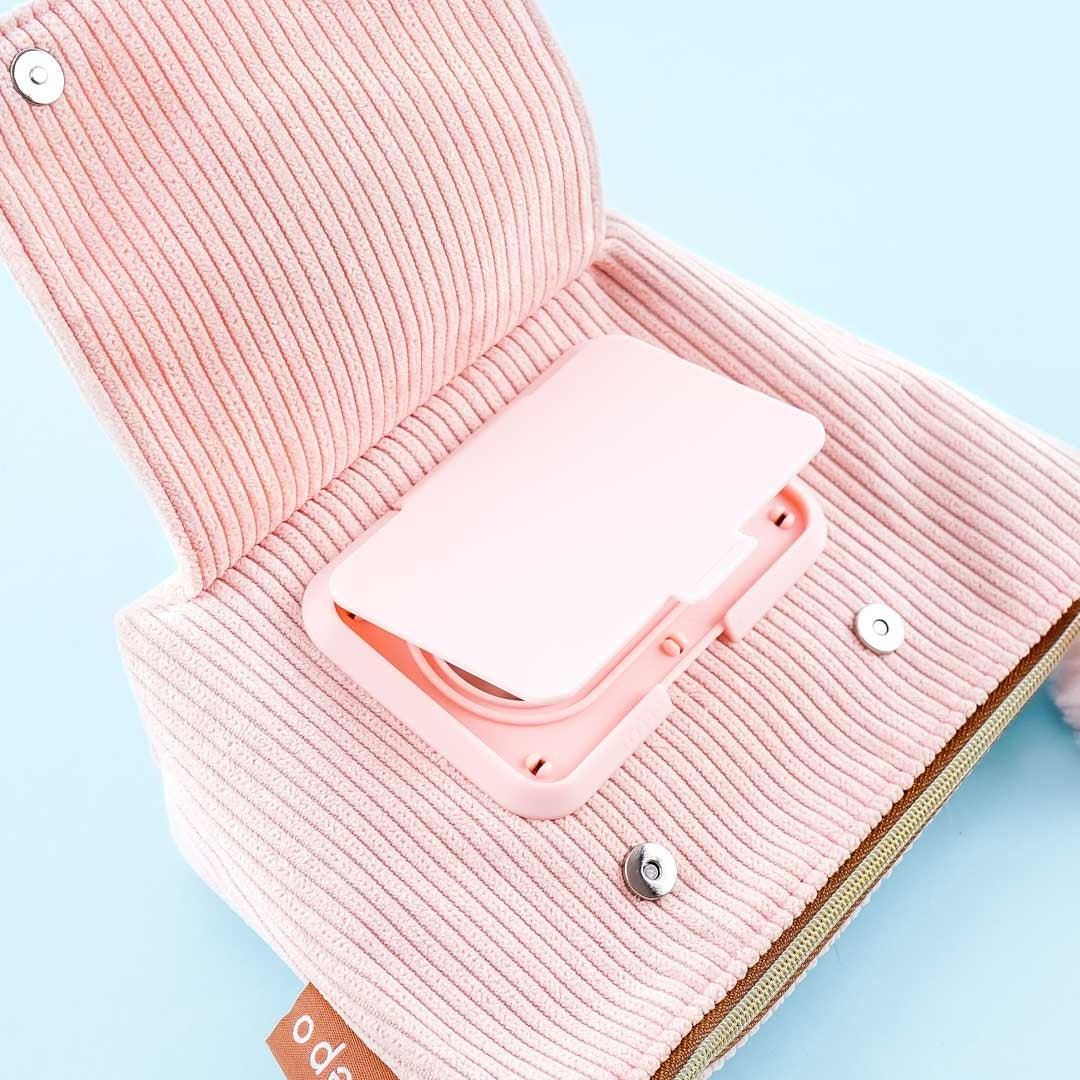 Features a special pouch area with a dispensing flap meant for tissues and makeup remover wipes