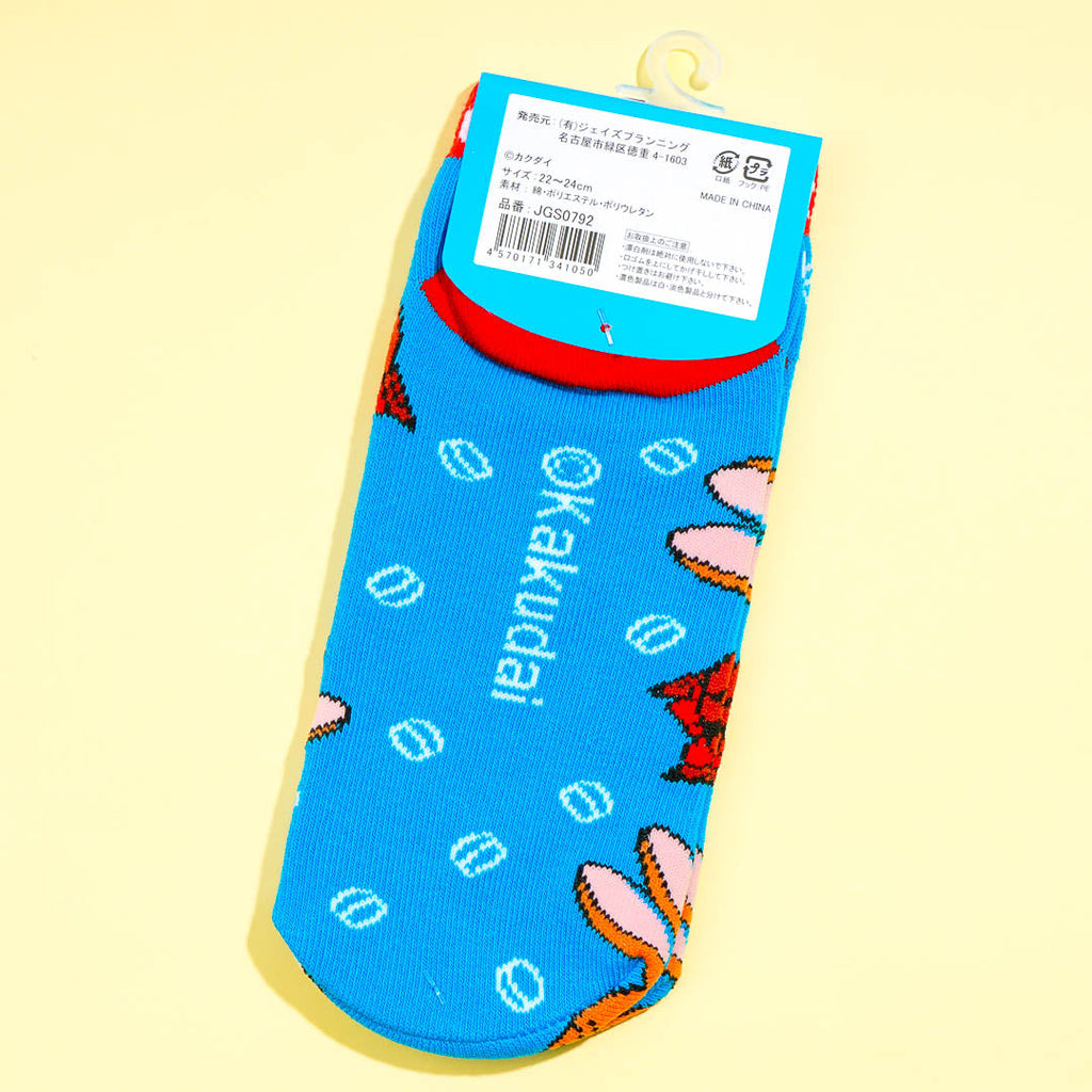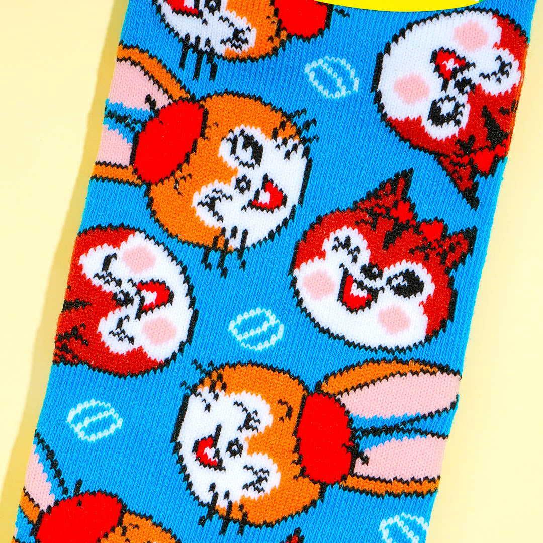 Wear these cute socks with your favorite sneakers! They feature the face patterns of the rabbit and squirrel from Kuppy ramune candy.