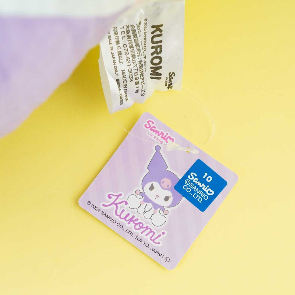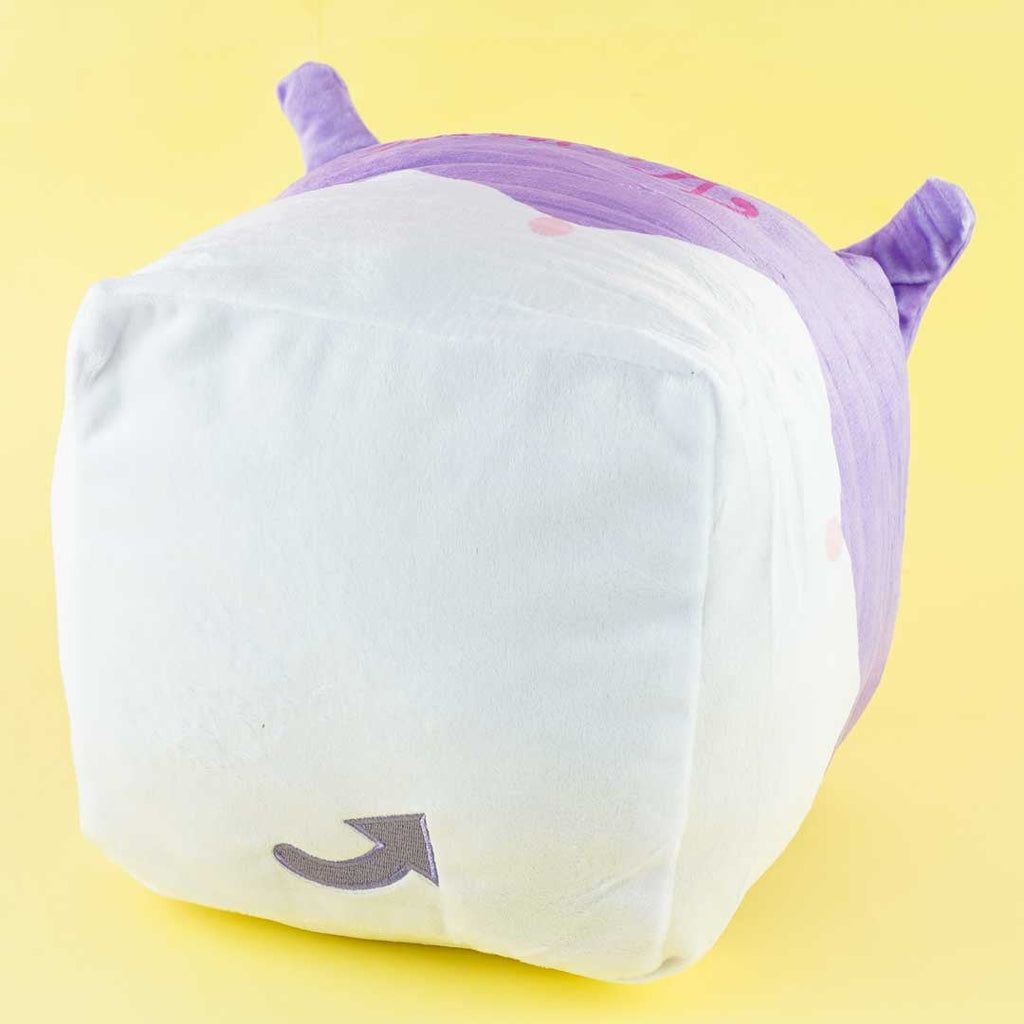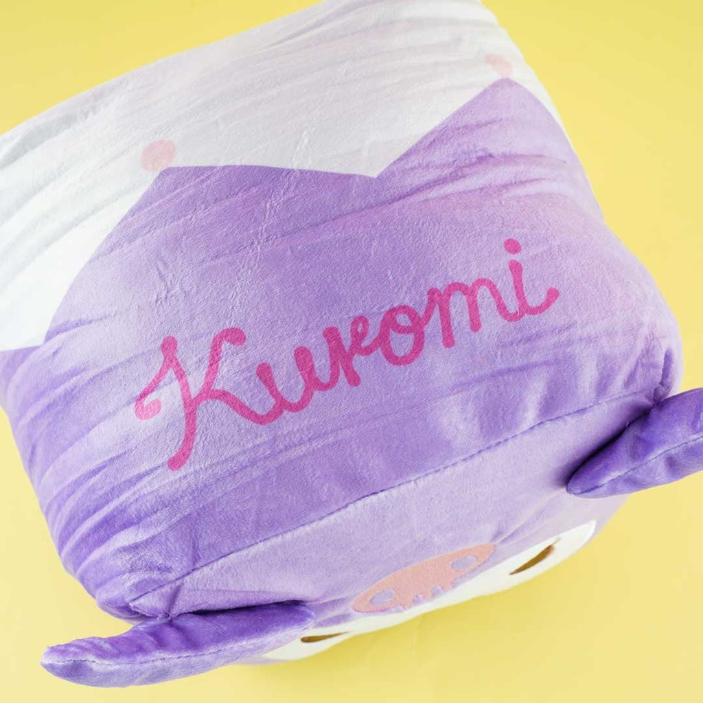 This cube-shaped Kuromi cushion is the perfect addition to your bedroom. Kuromi's face and tail have cute embroidery details. It also has a print that says "Kuromi" on its top side.