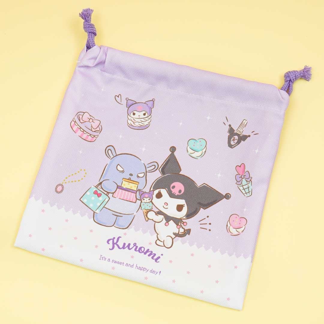 A cute drawstring bag featuring Kuromi and Baku having a shopping spree