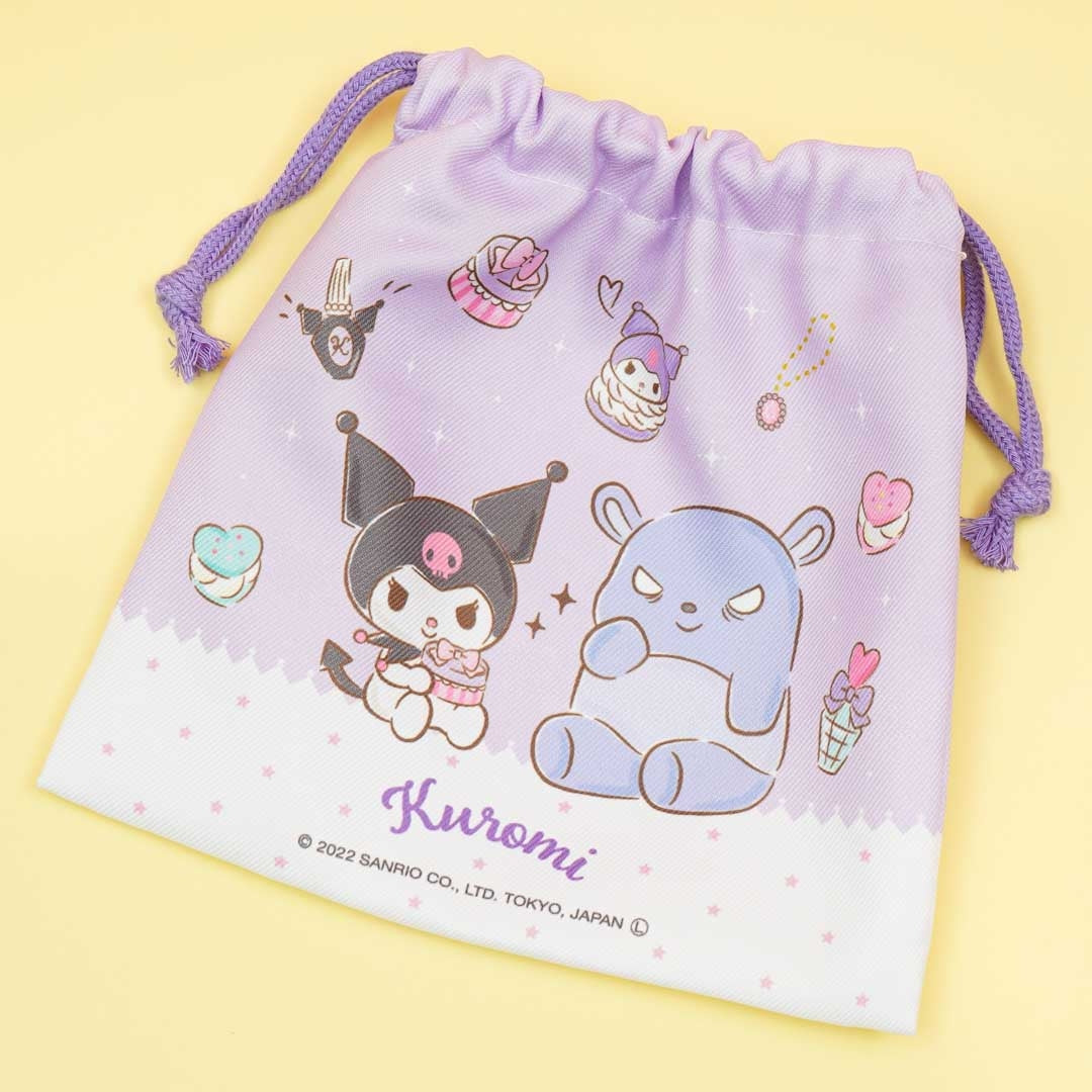 Organize your bows, clips, and other small hair accessories inside this super-soft polyester pouch! It’s decorated with prints of Kuromi and Baku having fun shopping for desserts and makeup! To close the pouch, simply pull the strings.