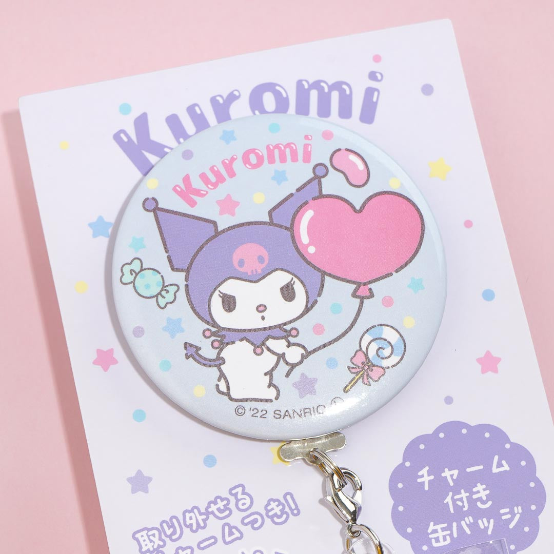 Decorate your purse with this kawaii badge! It features an illustration of Kuromi holding a heart-shaped balloon with some sweet treats. The cute badge also comes with a die-cut charm of Baku, Kuromi's best friend.