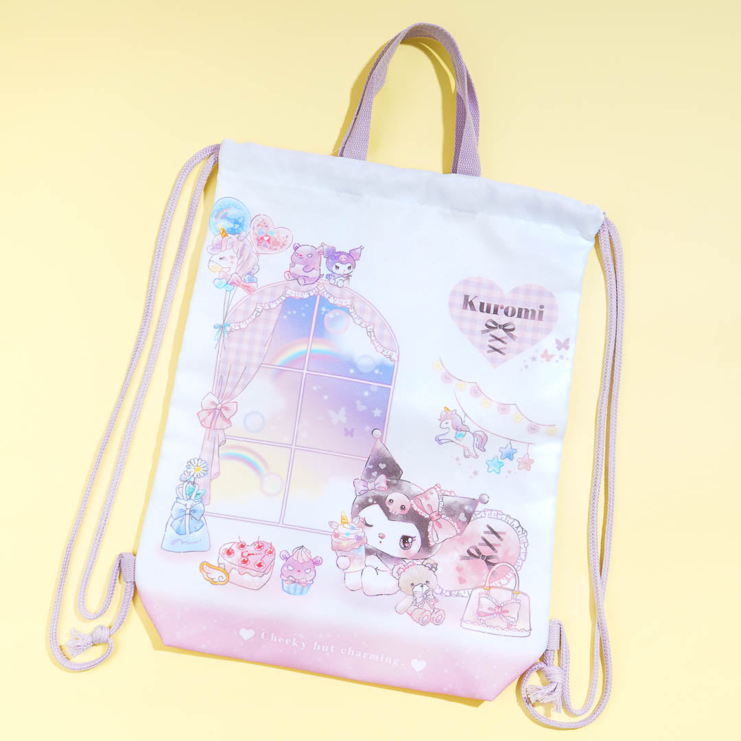 Walk around carrying your phone, wallet, and other essentials inside this kawaii drawstring bag. It features prints of Kuromi relaxing in her room! You can use this bag to bring your gym clothes too.
