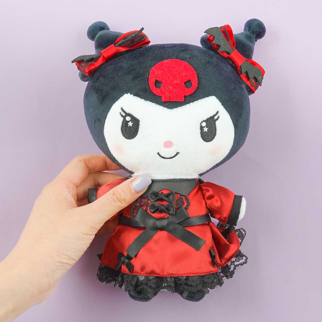 This small-sized Kuromi plushie is wearing a pretty red Lolita dress that’s decorated with black lace and ribbons! Add this cutie to your plush toy collection.