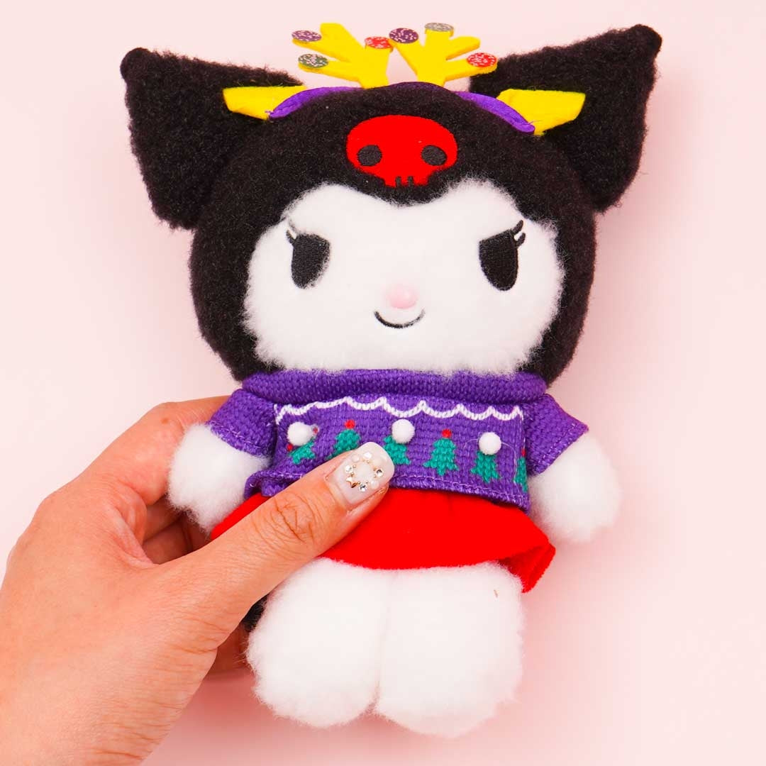 Snuggle beside this super cute medium-sized Kuromi plushie that’s made of fluffy boa! It’s wearing a kawaii Christmas knit sweater that has appliqué and embroidery, as well as a reindeer horn headband.