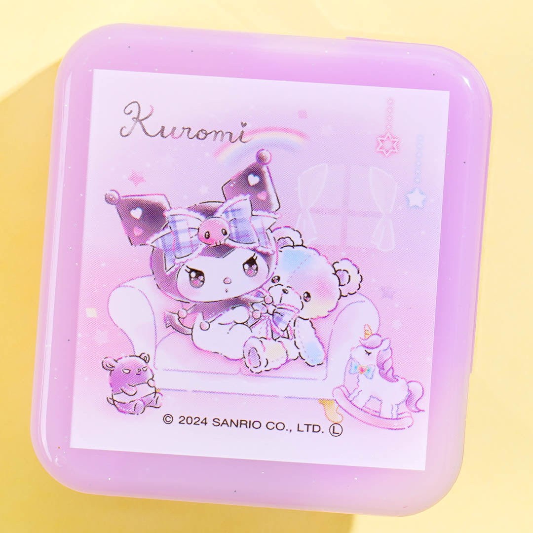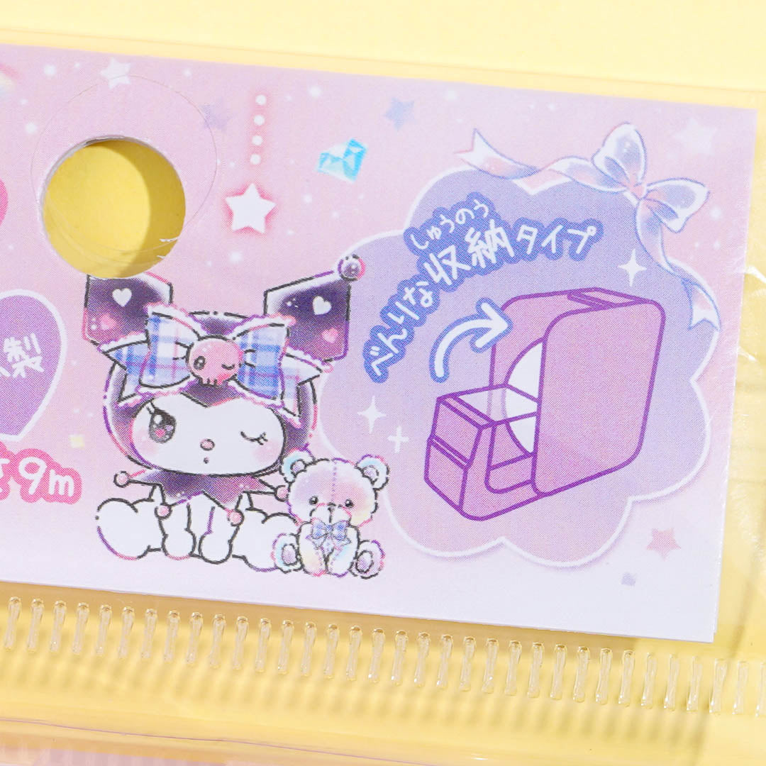 Add a touch of cuteness to your desk with this kawaii tape dispenser! It features illustrations of Kuromi playing with her colorful plushie. The blade of this dispenser can be stored when not in use for safety. It also comes with a clear cellophane tape!