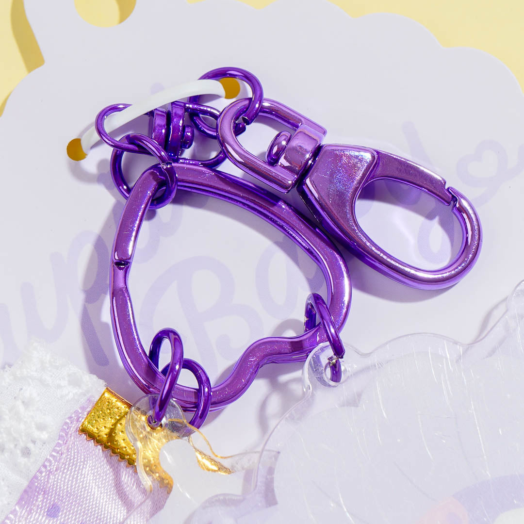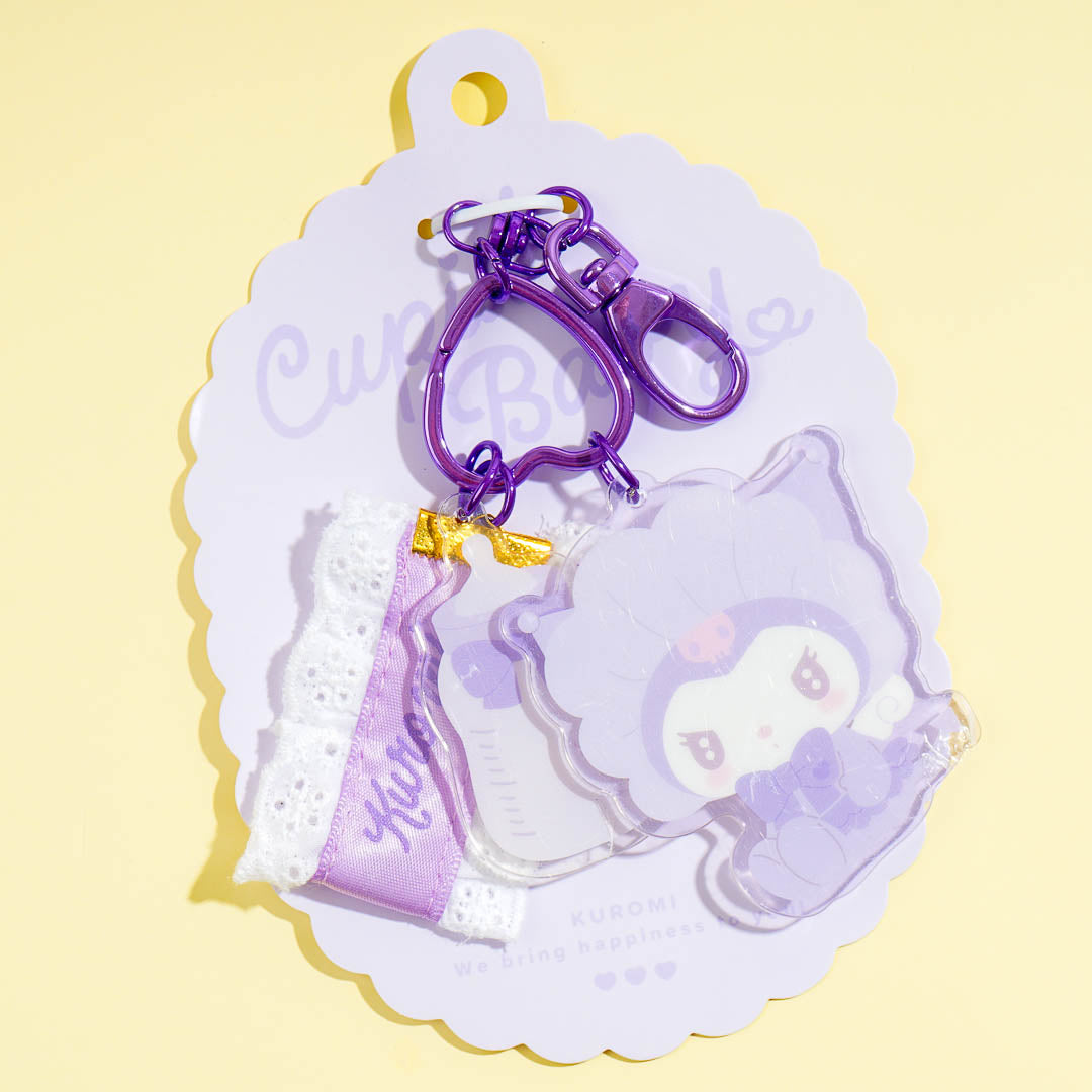 Add a dose of cuteness to your keys when you use this kawaii key holder! It features three charms with a baby Kuromi design. This has a heart-shaped metal carabiner for your keys and a metal hook that you can attach to your bag or purse.