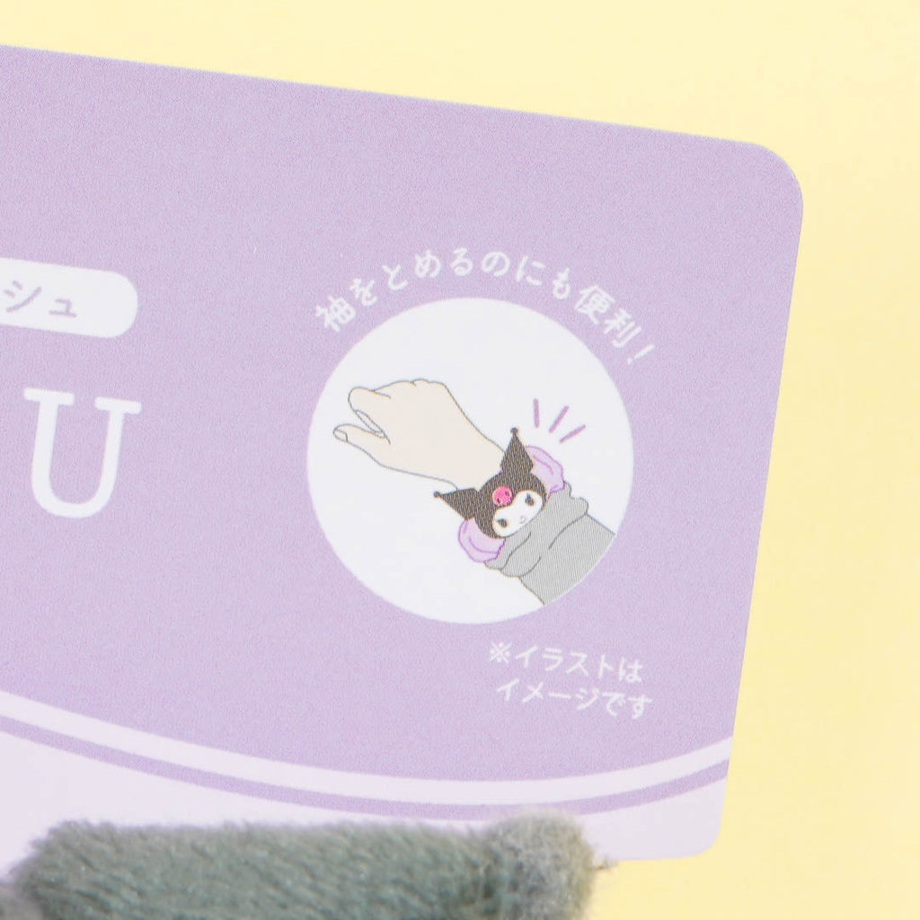 This set of scrunchies isn't for your hair, it's for your wrists! It features a plushie charm shaped like Kuromi's cute face. Wear each scrunchie on your wrists to prevent the sleeves of your clothes from getting wet when you wash your face!