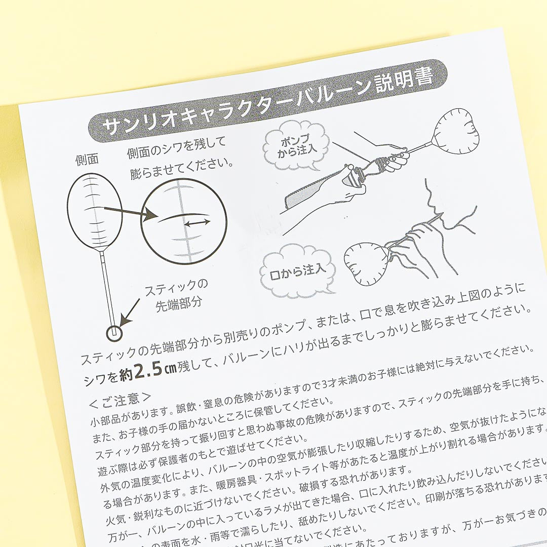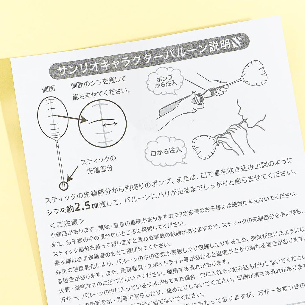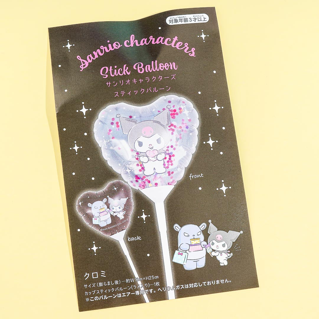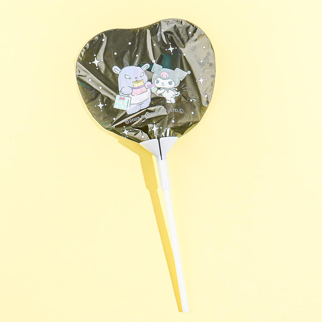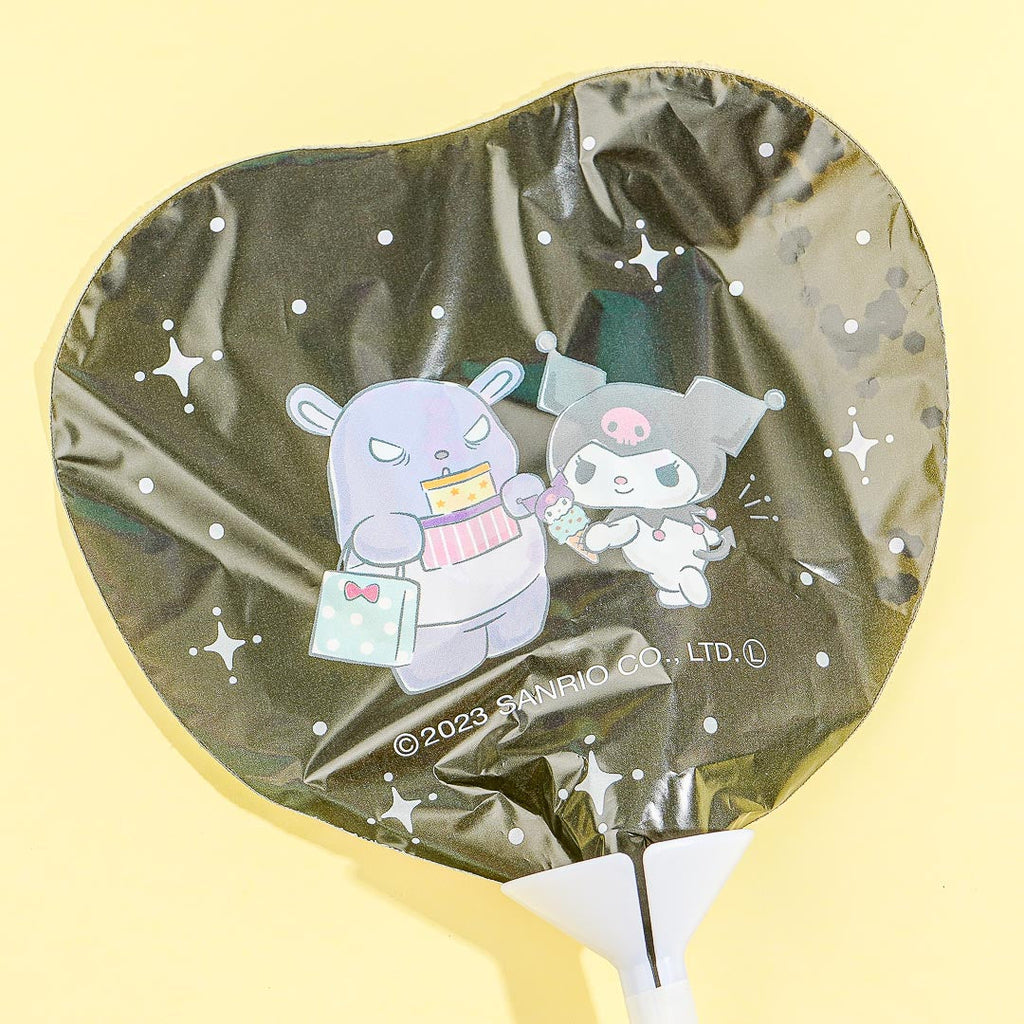 This cute heart-shaped stick balloon is decorated with prints of Kuromi hanging out with her friend Baku. It has glitter inside it! You can inflate the balloon just by blowing air through the stick.