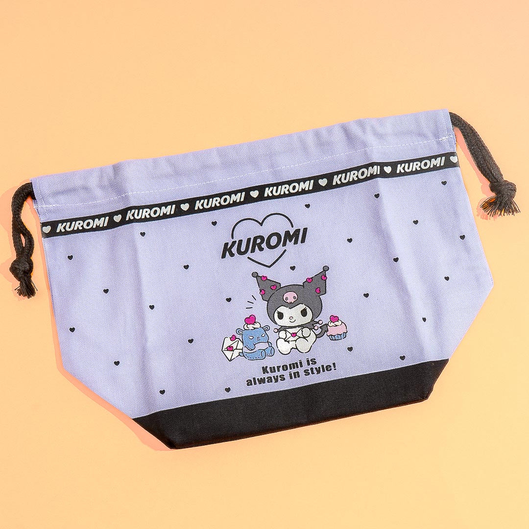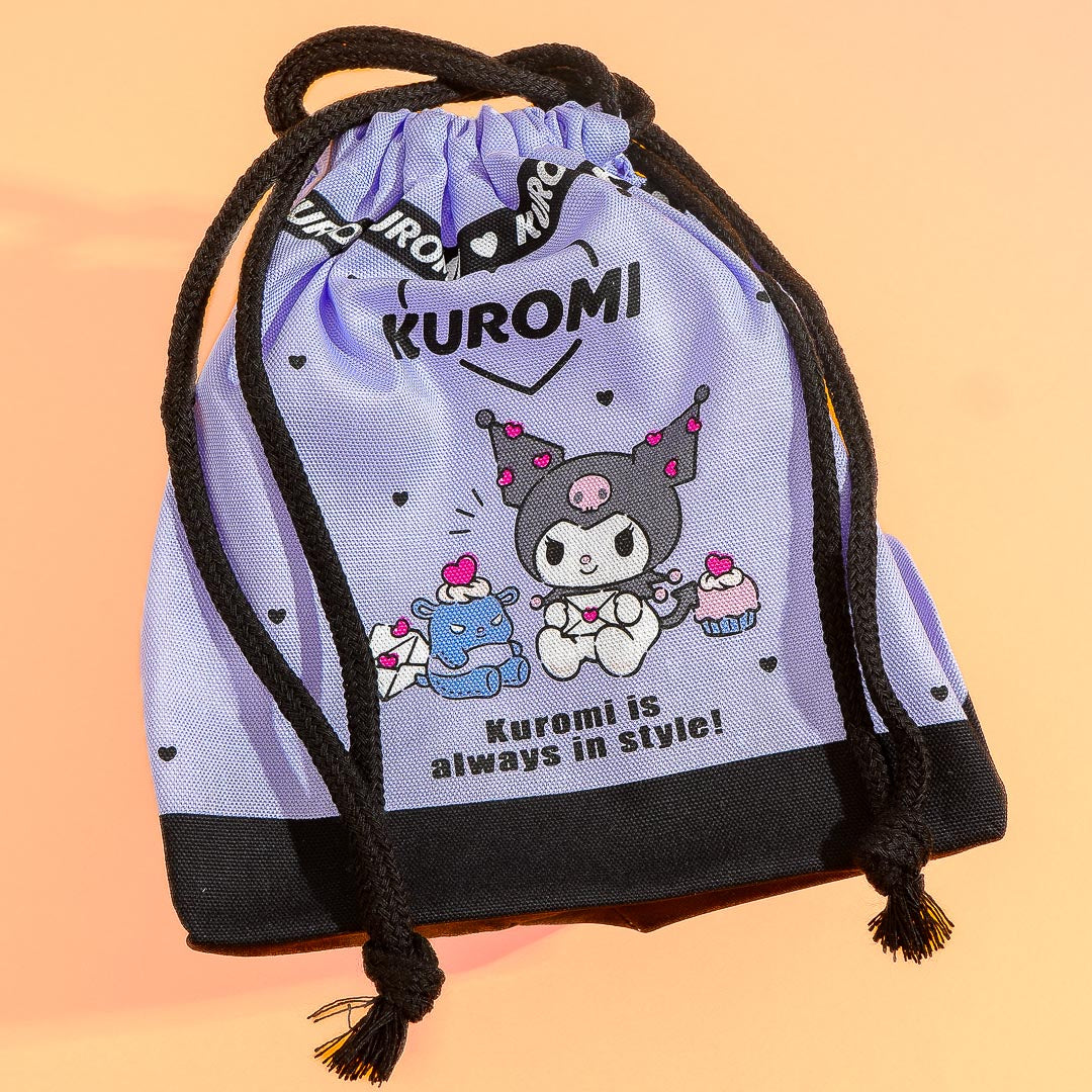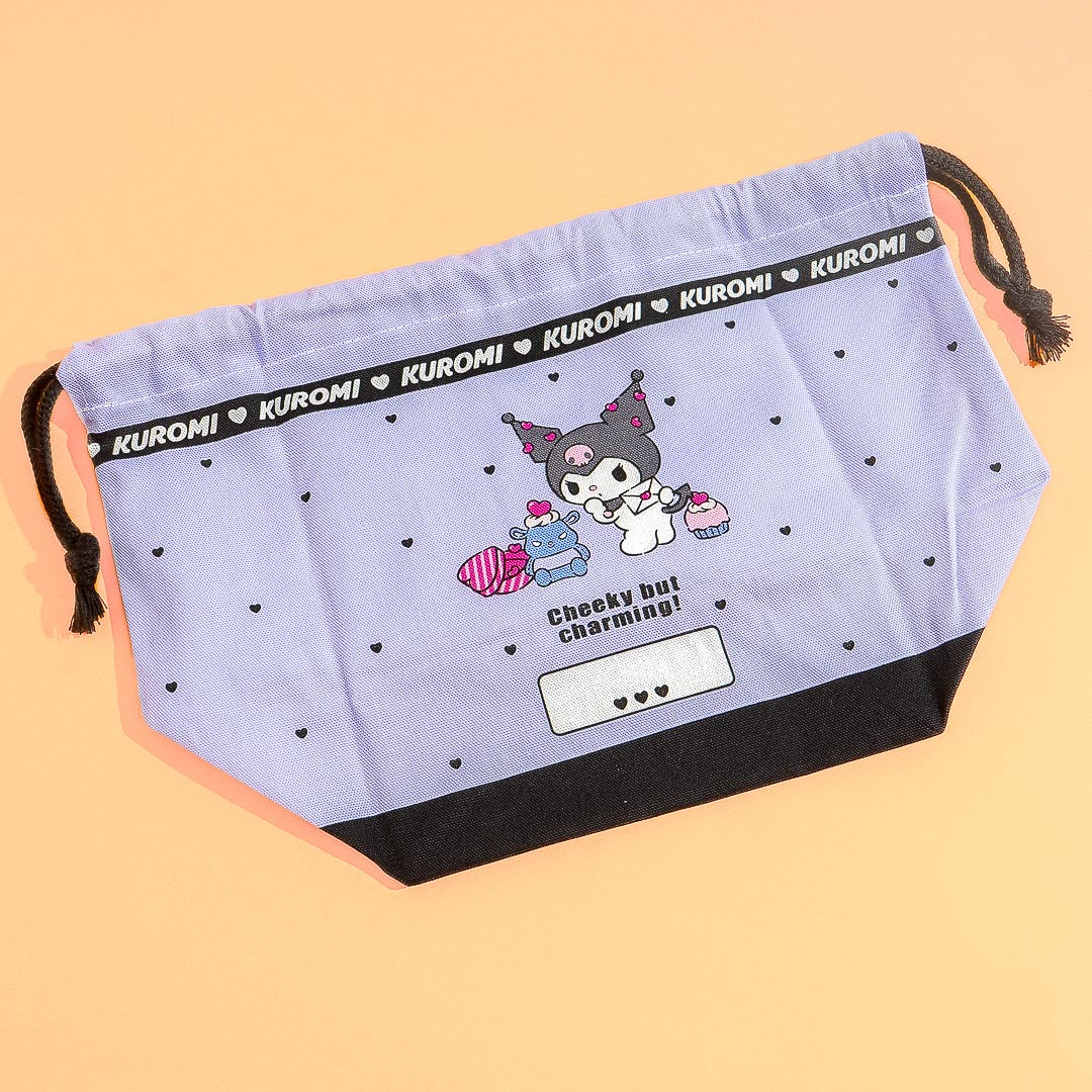 This super cute bag features kawaii prints of Kuromi and tiny hearts! It also has a blank space for you to write your name. Use this bag with gusset-style bottom to carry your lunch box and secure the contents by pulling the strings.