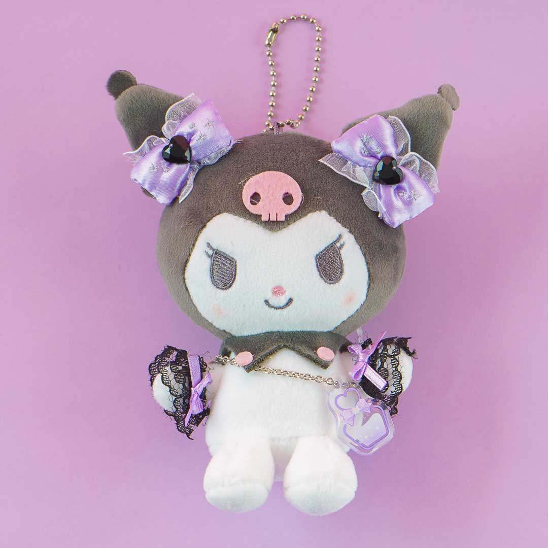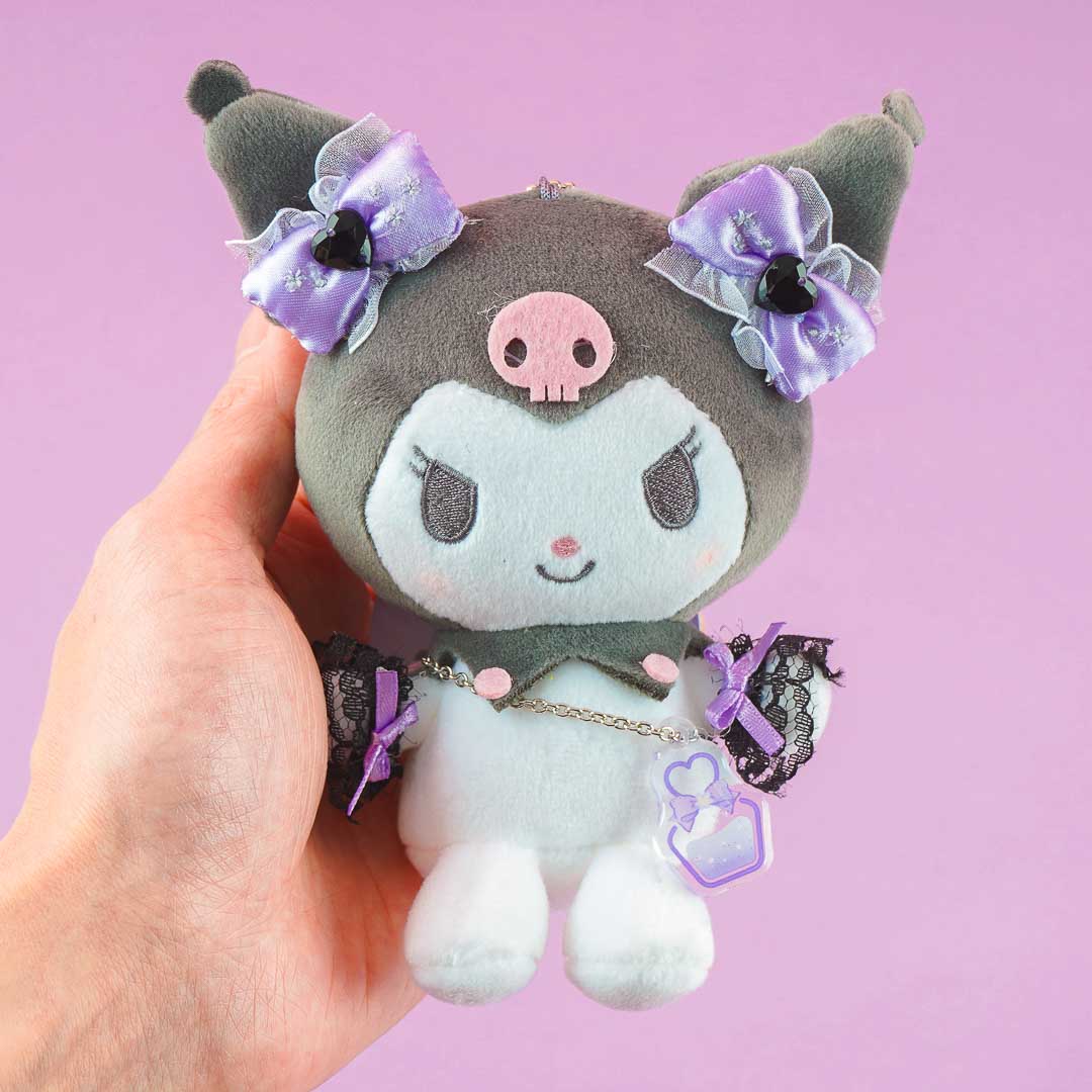 Kawaii-fy your bag by attaching this super cute Kuromi plushie charm! It’s wearing ribbons and lace and is holding a jewel perfume bottle.