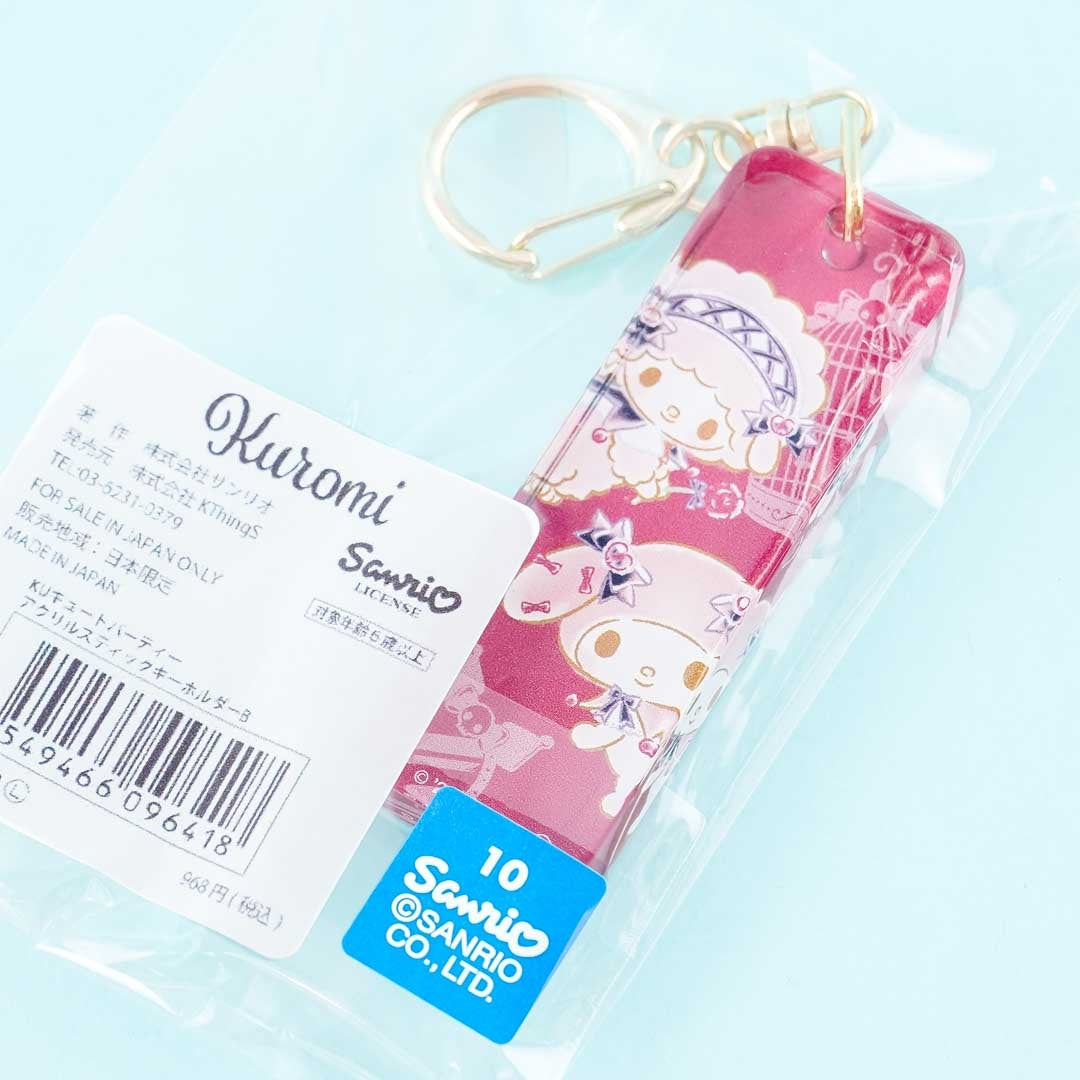Attach this kawaii acrylic charm with a gold metal clip to liven up your plain purse! It’s decorated with prints of Kuromi and her friends Baku, My Melody, and My Sweet Piano — all dressed up as lolitas.