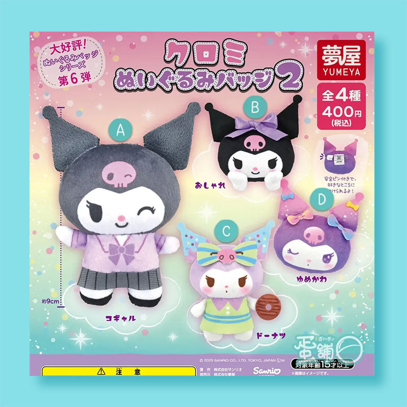 Get a surprise Kuromi plush badge from this gachapon series! There are four super cute designs in total, featuring Kuromi in different themed outfits. It comes with a pin on the back so you can attach it to your bag, pouch, or jacket!