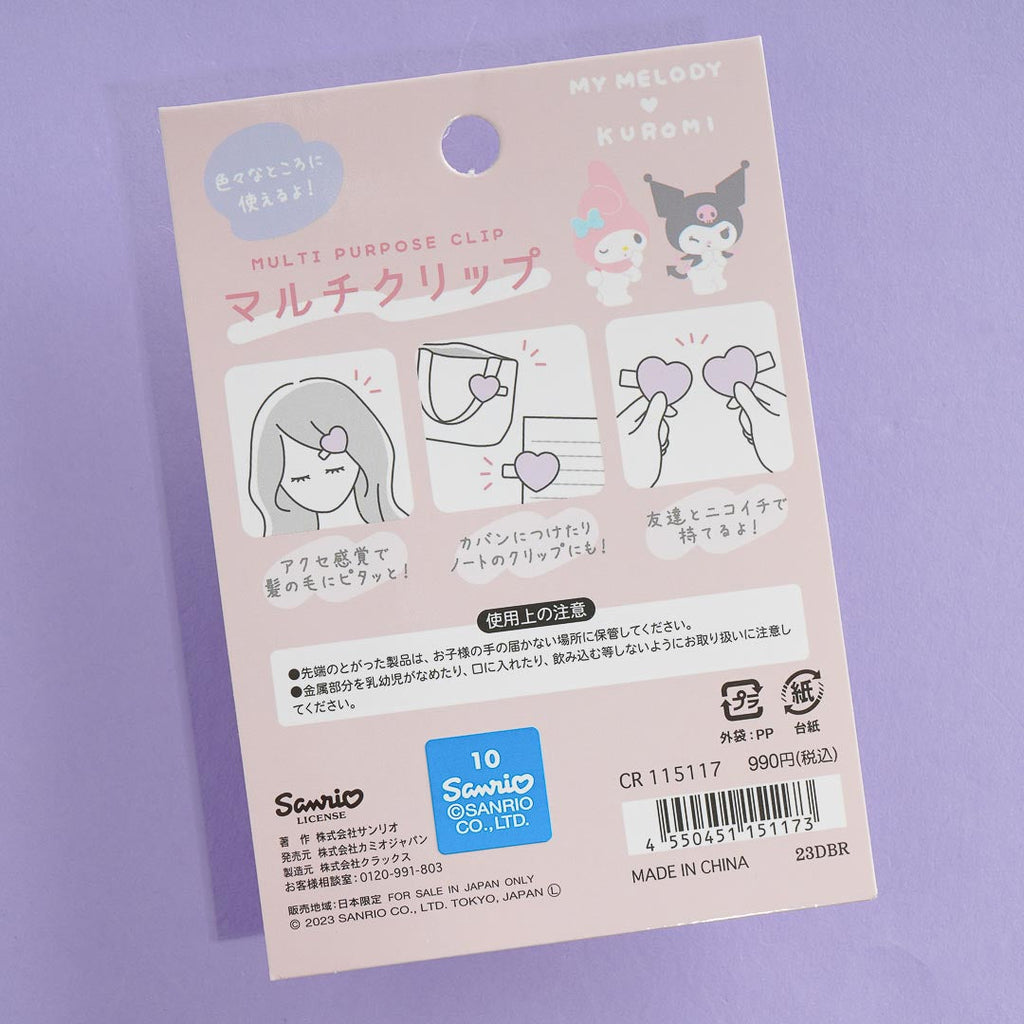 This kawaii metal clip set features glittery die-cut illustrations of My Melody and Kuromi blowing you a kiss! You can use them for your hair, as an accessory, or for around the house.