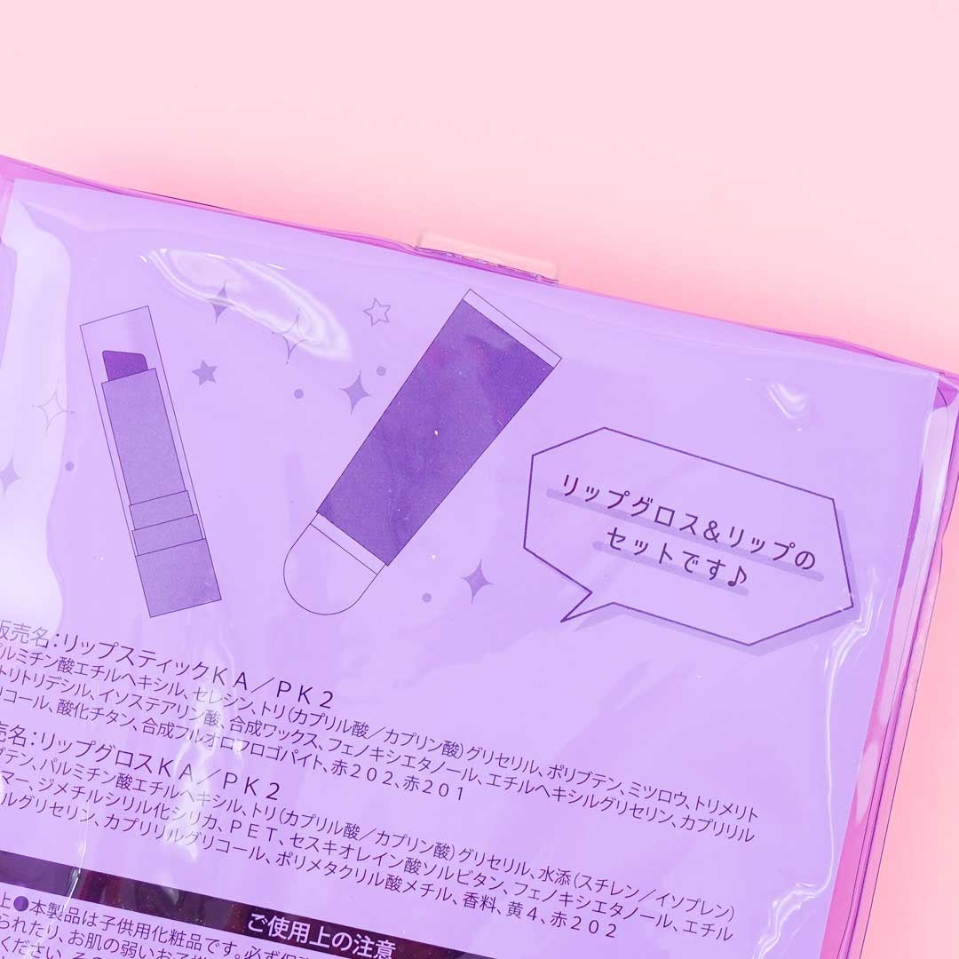 This kawaii lip kit features prints of Kuromi with My Melody! It comes with a lipstick bullet that has a pink-red shade, a matching tube of glittery red gloss, and a handy clear pouch with button closure. The entire set can be used even by children and is safe for almost all skin types!