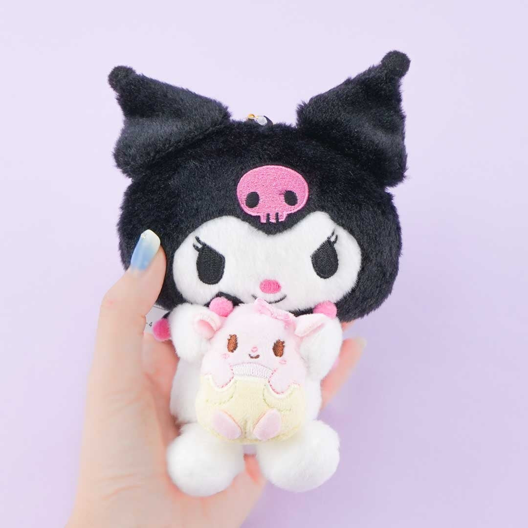 This cute Kuromi plushie is cuddling its nakayoshi or friend. Add this medium-sized stuffed toy to your kawaii collection! You can attach it to your favorite bag thanks to its removable ball chain.