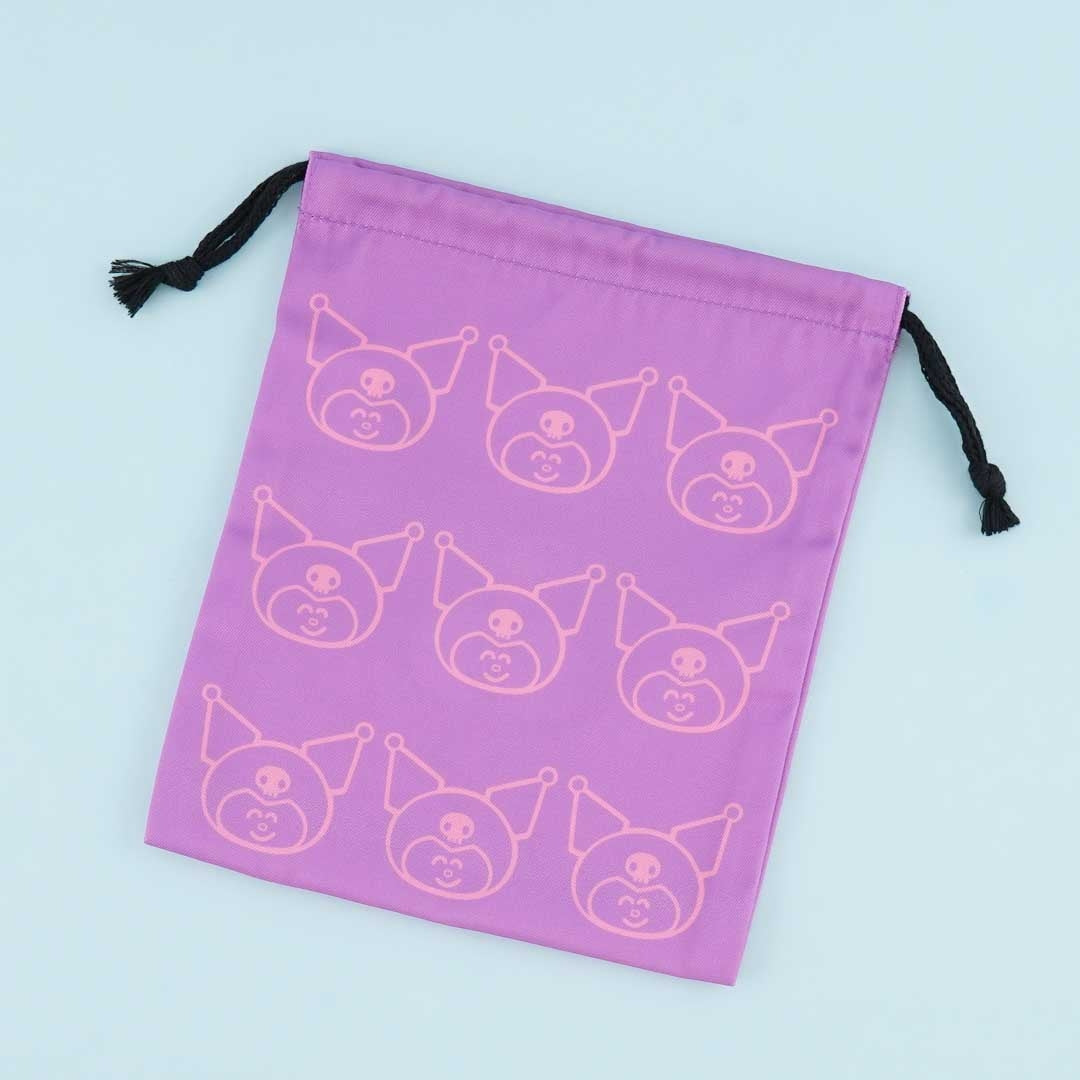 A kawaii drawstring pouch decorated with prints of Kuromi