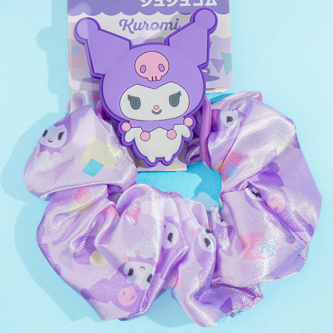 Experiment with different cute hairstyles using these hair accessories! The elastic hair tie features a Kuromi rubber charm and the scrunchie is decorated with prints of Kuromi and party colors.